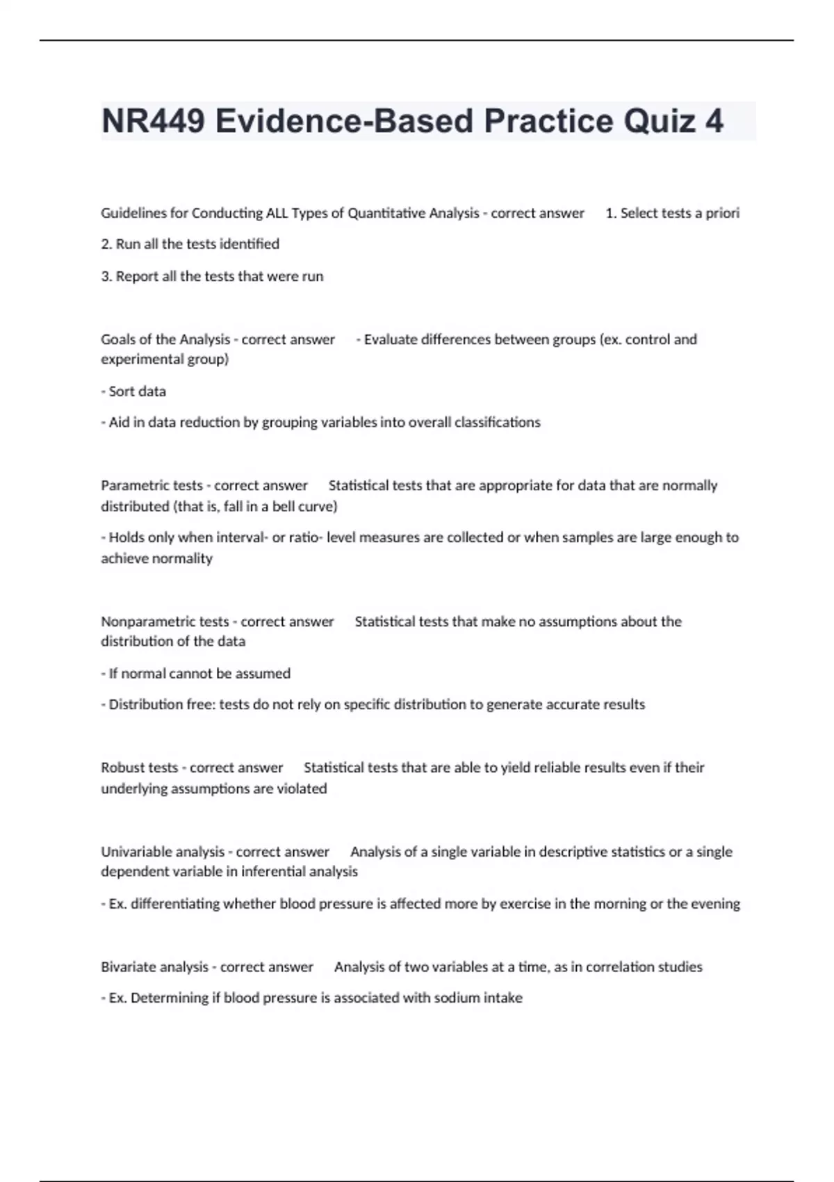 Guidelines for Conducting ALL Types of Quantitative Analysis - correct answer 1. Select tests a priori 2. Run all the tests identified 3. Report all the tests that were run Goals of the Analysis - correct answer - Evaluate differences between groups (ex. control and experimental group) - Sort data - Aid in data reduction by grouping variables into overall classifications Parametric tests - correct answer Statistical tests that are appropriate for data that are normally distributed (that is, fall in a bell curve) - Holds only when interval- or ratio- level measures are collected or when samples are large enough to achieve normality Nonparametric tests - correct answer Statistical tests that make no assumptions about the distribution of the data - If normal cannot be assumed - Distribution free: tests do not rely on specific distribution to generate accurate results Robust tests - correct answer Statistical tests that are able to yield reliable results even if their underlying assumptions are violated Univariable analysis - correct answer Analysis of a single variable in descriptive statistics or a single dependent variable in inferential analysis - Ex. differentiating whether blood pressure is affected more by exercise in the morning or the evening Bivariate analysis - correct answer Analysis of two variables at a time, as in correlation studies - Ex. Determining if blood pressure is associated with sodium intake Multivariate analysis - correct answer The simultaneous analysis of multiple variables - Ex. Determining if blood pressure is different in the morning or evening, and is associated with sodium intake, weight, and stress level Interferential analysis - correct answer Statistical tests to determine if results found in a sample are representative of a larger population Standard error - correct answer The error that arises from the sampling procedure; it is directly affected by variability and indirectly affected by sample size - Differences between samples and populations Point estimate - correct answer A statistic derived from a sample that is used to represent a population parameter - represents a single number Confidence interval - correct answer A range of values that includes, with a specified level of confidence, the actual population parameter - Used to estimate population parameters Effect size - correct answer The size of the differences between experimental and control groups compared to variability; an indication of the clinical importance of a finding - Determine how much of an effect can be expected The researcher must make decisions about the appropriateness of a statistical test based on the following factors: - correct answer - The requirements of the research question - The number of groups to be tested - The level of measurement of the independent and dependent variables - The statistical and mathematical assumptions of the test There are essentially three versions of this test that can be applied to determine differences in mean values: - correct answer 1. The one-sample t test quantifies the difference between a mean value in a sample and a mean value in the larger population. For example, a one- sample t test could test the difference between a hospital's mean length of stay and the national average. 2. The independent-samples t test quantifies the difference between the mean in one group and the mean in another group. An example would be a test to determine if mean lengths of stay were different for rural and urban hospitals. This t test variant could also be used as a test of effectiveness by comparing the mean in an experimental group to the value for a control group. For example, an independent-samples t test would be appropriate to determine if units that relied on standard orders sets had a shorter length of stay than units that did not. 3. The paired-samples t test quantifies the difference between a mean value measured in the same group over time. For example, a paired-sample t test could be used to answer questions about average length of stay before and after a change in Medicare reimbursement. Error Multiple Comparisons - correct answer The increased error associated with conducting multiple comparisons in the same analysis; the 5% allowable error for each test is multiplied by the number of comparisons, resulting in an inflated error rate Factors - correct answer Independent variables in an ANOVA that are measured as categories Levels - correct answer Categories that make up factors in an ANOVA ANOVA - correct answer - One of the most frequently used statistical tests in evidence-based research studies. - It is a staple for testing the effectiveness of interventions because of its versatility and its capacity to produce a tremendous amount of information. - It is effective in studies utilizing experimental and quasi- experimental designs Four Basic Kinds of ANOVA - correct answer 1. Univariate ANOVA - applied to determine if groups differ on a single numerical outcome 2. Repeated-measures ANOVA - used to determine if time is a factor in treatment conditions 3. Analysis of Covariance (ANCOVA) - used to determine if a covariate— commonly an extraneous variable—has an impact on the experiment 4. MANOVA - the multivariate version of ANOVA, is the most complex version of the test Magnitude of effect - correct answer The size of the differences between experimental and control groups; it supports clinical significance of the findings Three principles in mind when interpreting quantitative results as evidence for practice: - correct answer 1. A p value does not measure effect size. The p value refers to the probability of error, and nothing more. It means the results are statistically real, but it provides little information about the meaning of the results. Effect sizes offer more information about the magnitude of response. 2. Effect size is not a measure of import
