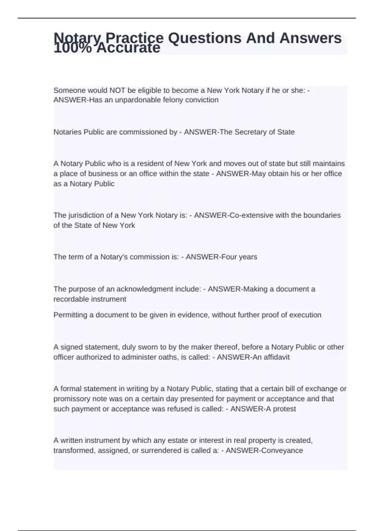 Someone would NOT be eligible to become a New York Notary if he or she: - ANSWER-Has an unpardonable felony conviction Notaries Public are commissioned by - ANSWER-The Secretary of State A Notary Public who is a resident of New York and moves out of state but still maintains a place of business or an office within the state - ANSWER-May obtain his or her office as a Notary Public The jurisdiction of a New York Notary is: - ANSWER-Co-extensive with the boundaries of the State of New York The term of a Notary's commission is: - ANSWER-Four years The purpose of an acknowledgment include: - ANSWER-Making a document a recordable instrument Permitting a document to be given in evidence, without further proof of execution A signed statement, duly sworn to by the maker thereof, before a Notary Public or other officer authorized to administer oaths, is called: - ANSWER-An affidavit A formal statement in writing by a Notary Public, stating that a certain bill of exchange or promissory note was on a certain day presented for payment or acceptance and that such payment or acceptance was refused is called: - ANSWER-A protest A written instrument by which any estate or interest in real property is created, transformed, assigned, or surrendered is called a: - ANSWER-Conveyance The written testimony of a witness, taken out of a court or another hearing proceeding, under oath or by affirmation before a Notary Public, which is intended to be used at the trial or hearing is called: - ANSWER-A deposition