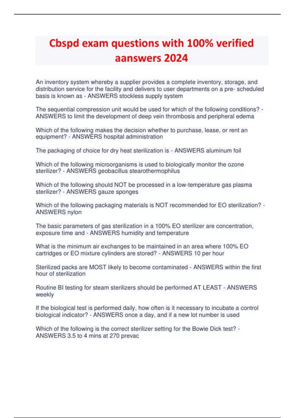What should the sterilizer access area pressure be? - ANSWERS Negative w/10 air exchanges per hour What two steps are involved in decontamination? - ANSWERS 1. Manual and/or automated mechanical cleaning 2. application of a thermal or chemical disinfection process Define Cleaning... - ANSWERS The removal of contamination from an item to the extent necessary for further processing or for the intended use. nosocomial infections are well documented and caused by... - ANSWERS poor or ineffective decontamination of instruments What are Employee hazards in the decontamination process? - ANSWERS Technicians work with a large amount of 1) unidentified bioburden 2) wet enviornment 3) handling contaminated sharps 4) must know procedures for proper handling, equipment, cleaning/sterilization agents How do you properly clean a device? - ANSWERS follow the device manufacturer's written instructions What is the starting point in sterilization? - ANSWERS Cleaning Define decontamination - ANSWERS The process of cleaning surgical instruments, patient care devices, and all involved surfaces in order to render areas and items safe for handling and/or further processing What are physical safety hazards? - ANSWERS -good body mechanics -correct body techniques and posture for lifting, pushing, pulling, and reaching -should be alert and correct anything that is a potential injury -lifts to lift heavy supplies, available work material, adjustable chairs, padding on sharp edges, correct height tables -proper clothing can prevent injury What is the weakest point of an instrument? - ANSWERS Box lock and jaws What does the ABC system stand for? - ANSWERS A: large dollar amount items not used frequently B: moderately priced and used frequently C: items w/ low dollar value What is just in time distribution? - ANSWERS Items are distributed to department by vendor no need for sterile storage or inventory control. What are specialty/ procedure carts? - ANSWERS Carts placed in specific departments based on procedures personalized to needs of departments easily accessible. What is case cart distribution? - ANSWERS visually in specialty areas case carts are delivered to department case cart is specialized to departments needs What is the exchange cart distribution? - ANSWERS Two identical carts are made one is out in the department and other stays in SPD