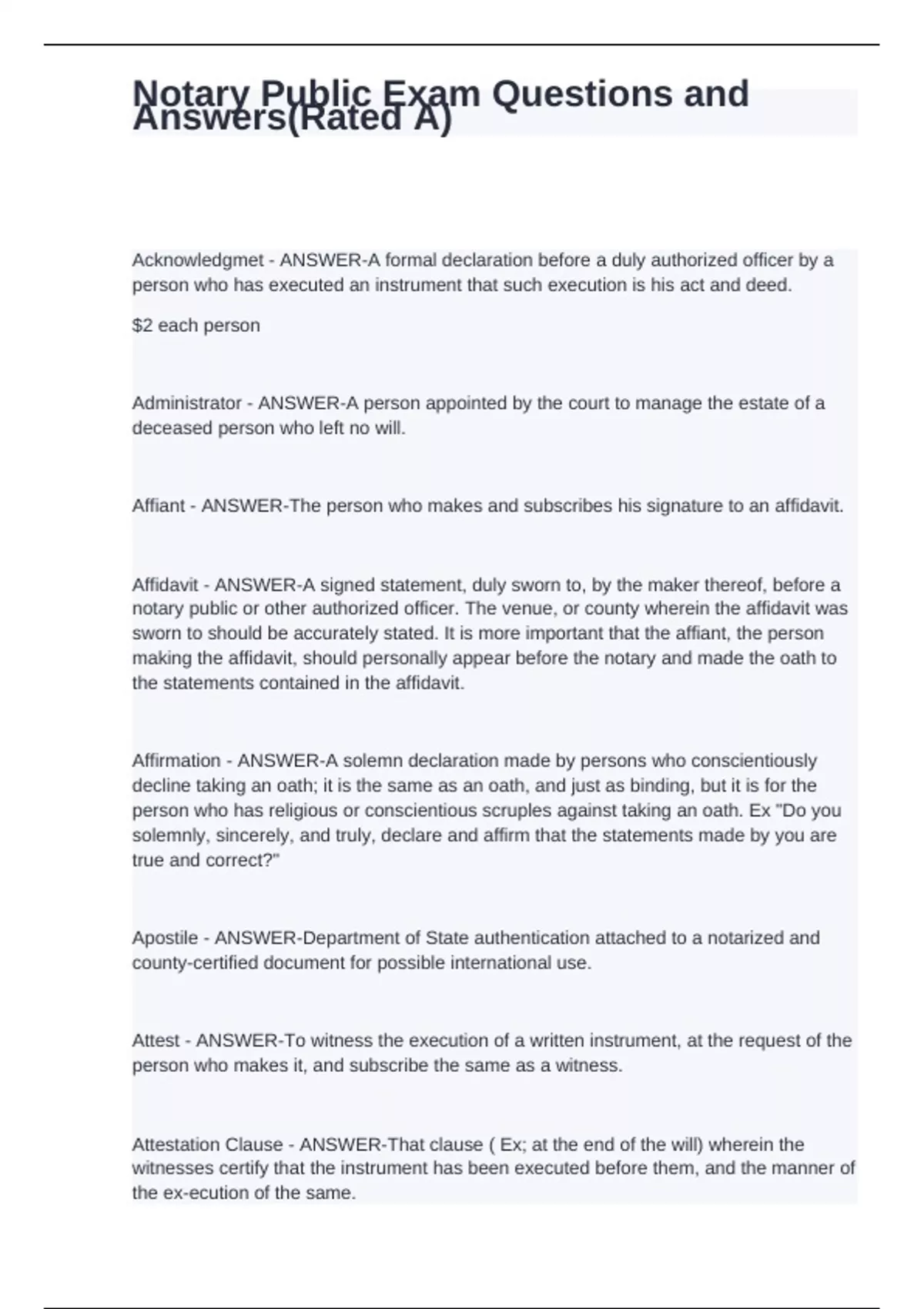 Acknowledgmet - ANSWER-A formal declaration before a duly authorized officer by a person who has executed an instrument that such execution is his act and deed. $2 each person Administrator - ANSWER-A person appointed by the court to manage the estate of a deceased person who left no will. Affiant - ANSWER-The person who makes and subscribes his signature to an affidavit. Affidavit - ANSWER-A signed statement, duly sworn to, by the maker thereof, before a notary public or other authorized officer. The venue, or county wherein the affidavit was sworn to should be accurately stated. It is more important that the affiant, the person making the affidavit, should personally appear before the notary and made the oath to the statements contained in the affidavit. Affirmation - ANSWER-A solemn declaration made by persons who conscientiously decline taking an oath; it is the same as an oath, and just as binding, but it is for the person who has religious or conscientious scruples against taking an oath. Ex "Do you solemnly, sincerely, and truly, declare and affirm that the statements made by you are true and correct?" Apostile - ANSWER-Department of State authentication attached to a notarized and county-certified document for possible international use. Attest - ANSWER-To witness the execution of a written instrument, at the request of the person who makes it, and subscribe the same as a witness. Attestation Clause - ANSWER-That clause ( Ex; at the end of the will) wherein the witnesses certify that the instrument has been executed before them, and the manner of the ex-ecution of the same. Authentication - ANSWER-A certificate subjoined by a county clerk to any certificate of proof or acknowledgment or oath signed by a notary; this COUNTY CLERK'S CERTIFICATE authenticates or verifies the authority of the notary public to act as such. Authentication Certificate $3