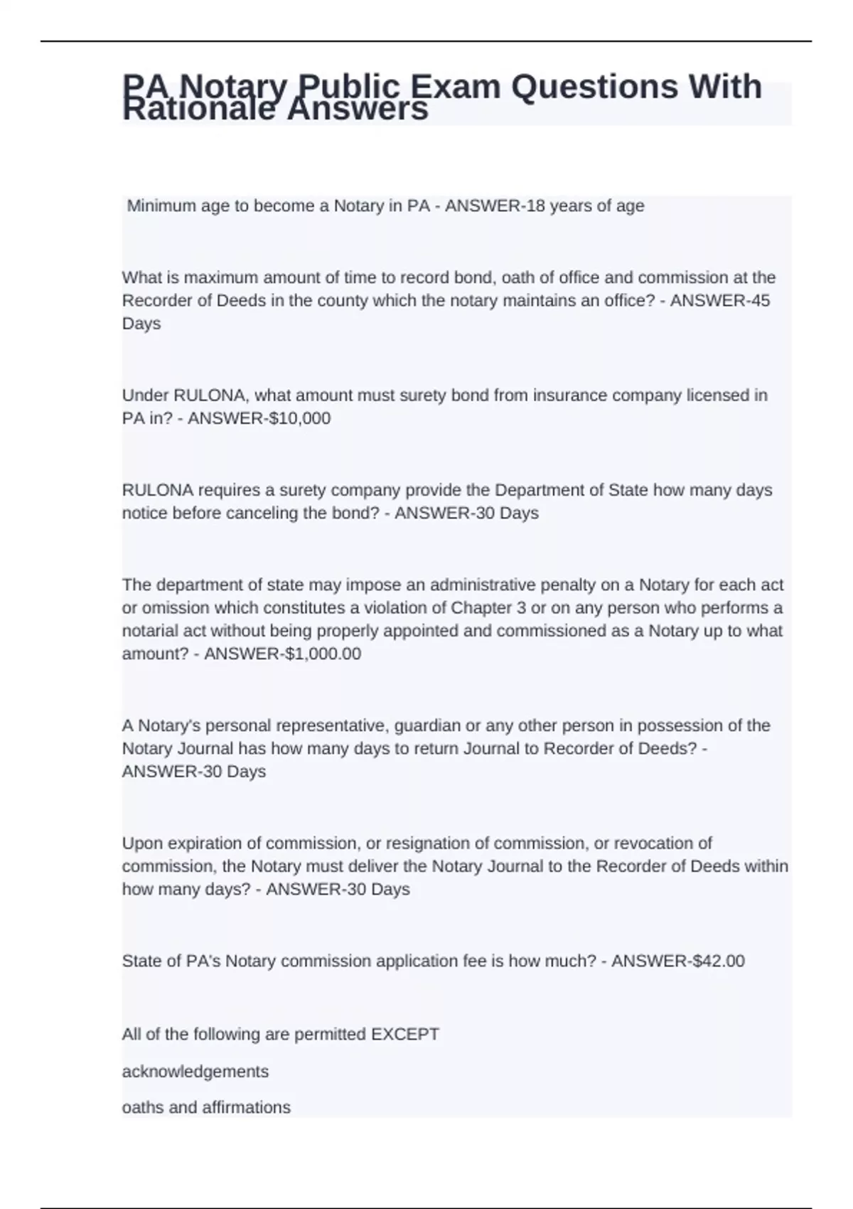 Minimum age to become a Notary in PA - ANSWER-18 years of age What is maximum amount of time to record bond, oath of office and commission at the Recorder of Deeds in the county which the notary maintains an office? - ANSWER-45 Days Under RULONA, what amount must surety bond from insurance company licensed in PA in? - ANSWER-$10,000 RULONA requires a surety company provide the Department of State how many days notice before canceling the bond? - ANSWER-30 Days The department of state may impose an administrative penalty on a Notary for each act or omission which constitutes a violation of Chapter 3 or on any person who performs a notarial act without being properly appointed and commissioned as a Notary up to what amount? - ANSWER-$1,000.00 A Notary's personal representative, guardian or any other person in possession of the Notary Journal has how many days to return Journal to Recorder of Deeds? - ANSWER-30 Days Upon expiration of commission, or resignation of commission, or revocation of commission, the Notary must deliver the Notary Journal to the Recorder of Deeds within how many days? - ANSWER-30 Days State of PA's Notary commission application fee is how much? - ANSWER-$42.00 All of the following are permitted EXCEPT