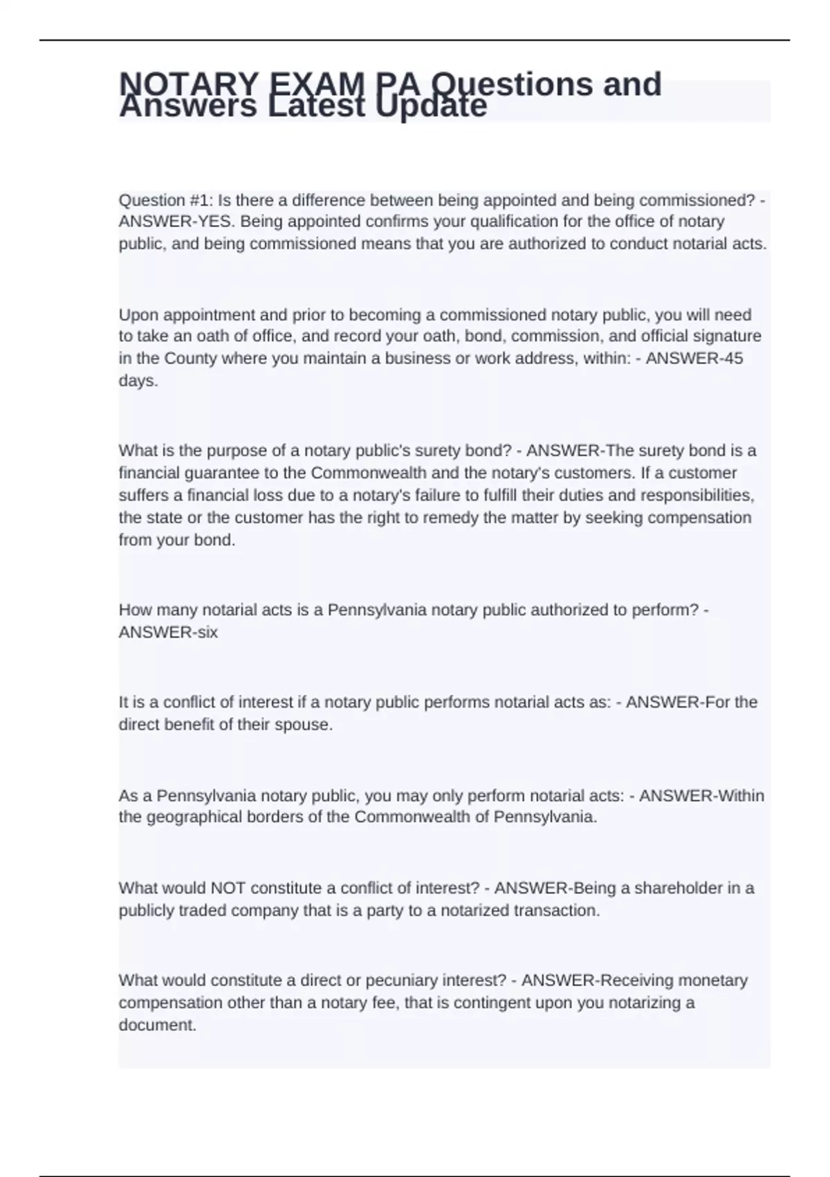 Question #1: Is there a difference between being appointed and being commissioned? - ANSWER-YES. Being appointed confirms your qualification for the office of notary public, and being commissioned means that you are authorized to conduct notarial acts. Upon appointment and prior to becoming a commissioned notary public, you will need to take an oath of office, and record your oath, bond, commission, and official signature in the County where you maintain a business or work address, within: - ANSWER-45 days. What is the purpose of a notary public's surety bond? - ANSWER-The surety bond is a financial guarantee to the Commonwealth and the notary's customers. If a customer suffers a financial loss due to a notary's failure to fulfill their duties and responsibilities, the state or the customer has the right to remedy the matter by seeking compensation from your bond. How many notarial acts is a Pennsylvania notary public authorized to perform? - ANSWER-six It is a conflict of interest if a notary public performs notarial acts as: - ANSWER-For the direct benefit of their spouse. As a Pennsylvania notary public, you may only perform notarial acts: - ANSWER-Within the geographical borders of the Commonwealth of Pennsylvania. What would NOT constitute a conflict of interest? - ANSWER-Being a shareholder in a publicly traded company that is a party to a notarized transaction. What would constitute a direct or pecuniary interest? - ANSWER-Receiving monetary compensation other than a notary fee, that is contingent upon you notarizing a document. A notary public may establish the fee for the following service: - ANSWER-Copying a notarized document. What form of identification would NOT be classified as satisfactory evidence? - ANSWER-Student ID. When a notary public provides a customer with a receipt for notarial and related services such as making a copy of a notarized document, all of the fees should? - ANSWER-Itemized separately on a receipt. In addition to verifying an individual's identity, what else should you determine about an individual before performing a notarial act? - ANSWER-If the individual has the competency and capacity to execute a record