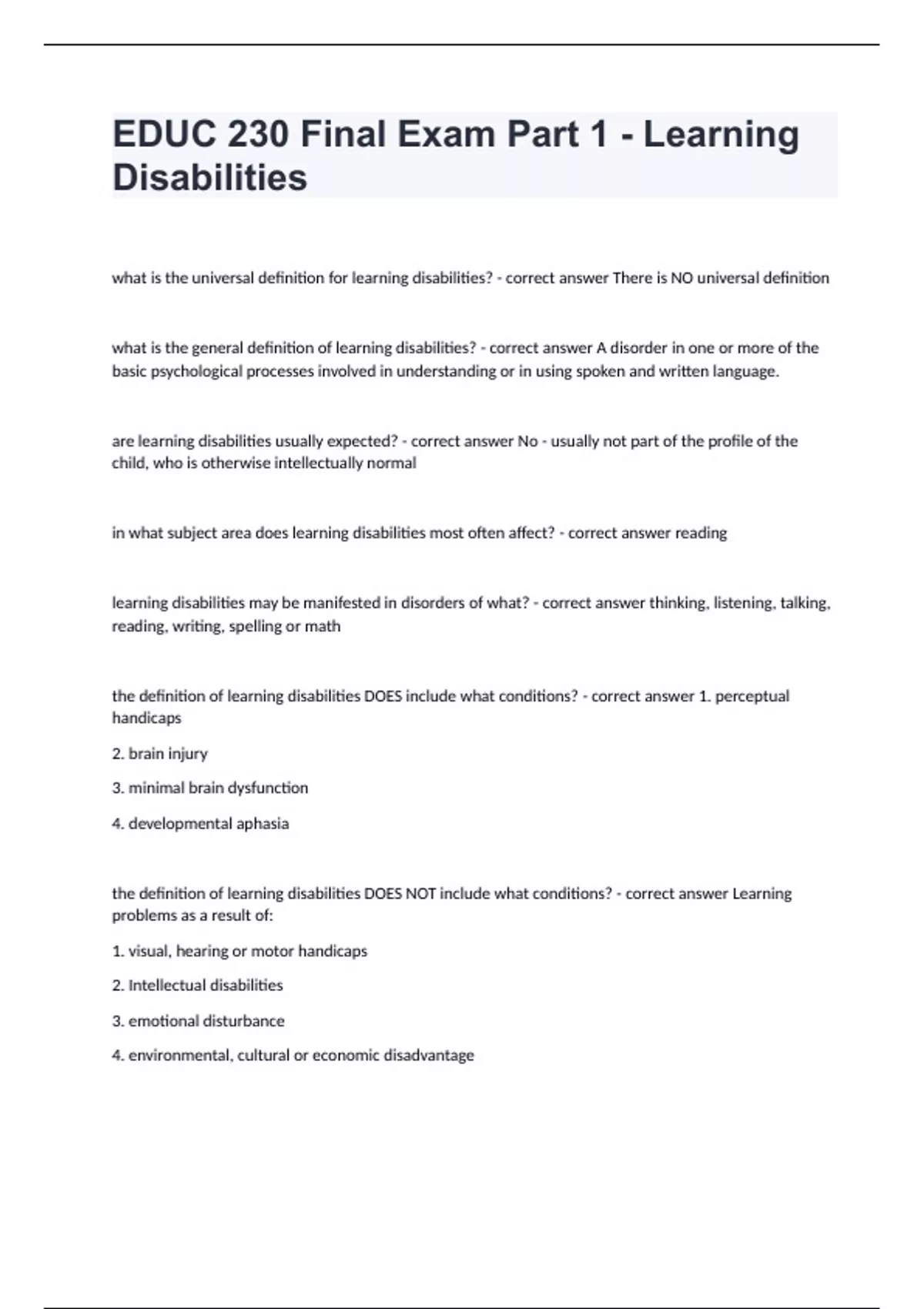 EDUC 230 Final Exam Part 1 - Learning Disabilities fully solved graded A+what is the universal definition for learning disabilities? - correct answer There is NO universal definition what is the general definition of learning disabilities? - correct answer A disorder in one or more of the basic psychological processes involved in understanding or in using spoken and written language. are learning disabilities usually expected? - correct answer No - usually not part of the profile of the child, who is otherwise intellectually normal in what subject area does learning disabilities most often affect? - correct answer reading learning disabilities may be manifested in disorders of what? - correct answer thinking, listening, talking, reading, writing, spelling or math the definition of learning disabilities DOES include what conditions? - correct answer 1. perceptual handicaps 2. brain injury 3. minimal brain dysfunction 4. developmental aphasia the definition of learning disabilities DOES NOT include what conditions? - correct answer Learning problems as a result of: 1. visual, hearing or motor handicaps 2. Intellectual disabilities 3. emotional disturbance 4. environmental, cultural or economic disadvantage