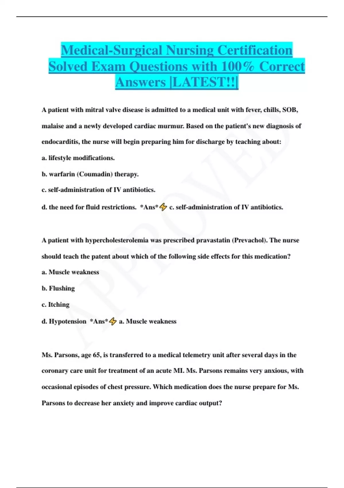 Medical-Surgical Nursing Certification Solved Exam Questions with 100% Correct Answers |LATEST!!| A patient with mitral valve disease is admitted to a medical unit with fever, chills, SOB, malaise and a newly developed cardiac murmur. Based on the patient's new diagnosis of endocarditis, the nurse will begin preparing him for discharge by teaching about: a. lifestyle modifications. b. warfarin (Coumadin) therapy. c. self-administration of IV antibiotics. d. the need for fluid restrictions. *Ans* c. self-administration of IV antibiotics. A patient with hypercholesterolemia was prescribed pravastatin (Prevachol). The nurse should teach the patent about which of the following side effects for this medication? a. Muscle weakness b. Flushing c. Itching d. Hypotension *Ans* a. Muscle weakness Ms. Parsons, age 65, is transferred to a medical telemetry unit after several days in the coronary care unit for treatment of an acute MI. Ms. Parsons remains very anxious, with occasional episodes of chest pressure. Which medication does the nurse prepare for Ms. Parsons to decrease her anxiety and improve cardiac output? a. Nitroprusside (Nipride) b. Diazepam (Valium) c. Morphine sulfate (MS) d. Dopamine (Intropin) *Ans* c. Morphine sulfate (MS) The nurse's assessment of Mr. Harrison's response to digoxin will include which of the following as the most common early indicator of toxicity. a. Anorexia b. Diarrhea c. Headache d. Confusion *Ans* a. Anorexia The nurse is also aware that some of Mr. Harrison's medications can increase serum digitalis concentrations and thus the risk for digoxin toxicity. These include: a. calcium carbonate (Tums) b. cholestyramine (Questran) c. sulfasalazine (Azulfidine) d. amiodarone (Cordarone) *Ans* d. amiodarone (Cordarone) The nurse teaches Ms. Pratt about the use of nitroglycerin. Following teaching, it is most important for the patient to: a. indicate she will call for help if three nitroglycerin tablets don not relieve her chest pain. b. identify flushing and dizziness as common side effects of the drug. c. verbalize understanding that nitroglycerin will help prevent her from having a myocardial infarction (MI