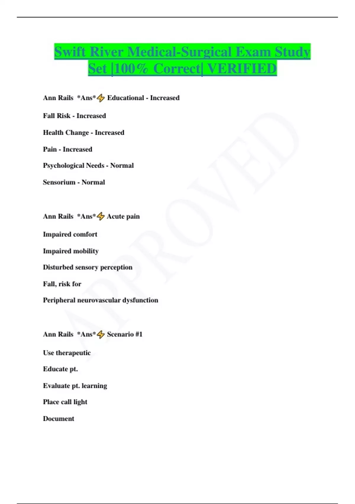 Swift River Medical-Surgical Exam Study Set |100% Correct| VERIFIED Ann Rails *Ans* Educational - Increased Fall Risk - Increased Health Change - Increased Pain - Increased Psychological Needs - Normal Sensorium - Normal Ann Rails *Ans* Acute pain Impaired comfort Impaired mobility Disturbed sensory perception Fall, risk for Peripheral neurovascular dysfunction Ann Rails *Ans* Scenario #1 Use therapeutic Educate pt. Evaluate pt. learning Place call light Document Scenario #2 Wash and glove hands Assess Provide comfort measures Notify doctor Document Scenario #3 Listen to pt. concerns Reassure pt. of options Notify lead nurse/doctor Contact Social Services Document Scenario #4 Wash and glove hands Visual assessment Do not disturb Verify Call Light Document Scenario #5 Assess for bowel sounds Encourage fluids/fiber/ambulatio