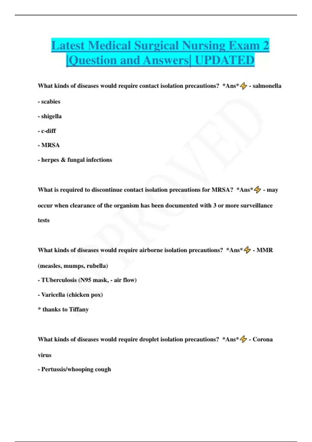 Latest Medical Surgical Nursing Exam 2 |Question and Answers| UPDATED What kinds of diseases would require contact isolation precautions? *Ans* - salmonella - scabies - shigella - c-diff - MRSA - herpes & fungal infections What is required to discontinue contact isolation precautions for MRSA? *Ans* - may occur when clearance of the organism has been documented with 3 or more surveillance tests What kinds of diseases would require airborne isolation precautions? *Ans* - MMR (measles, mumps, rubella) - TUberculosis (N95 mask, - air flow) - Varicella (chicken pox) * thanks to Tiffany What kinds of diseases would require droplet isolation precautions? *Ans* - Corona virus - Pertussis/whooping cough - Influenza/flu - Meningitis - Pneumonia * thanks to Tiffany & Jay Reverse isolation *Ans* - neutropenic isolation precautions What are neutropenic isolation precautions used for? *Ans* - Patient that is immunocompromised with low # of neutrophils. In this incidence were more concerned about the patient acquiring a disease. radiation isolation precautions *Ans* - steps taken to isolate a patient who has received radiation from others who might be harmed by the radiation from a distance - all equipment must stay in room until removed by someone who knows how to decontaminate it Airborne precautions distance *Ans* - 10 feet or more Droplet precautions distance *Ans* - 3 to 6 feet Clinical manifestations of TB *Ans* - fatigue - weight loss & anorexia - night sweats