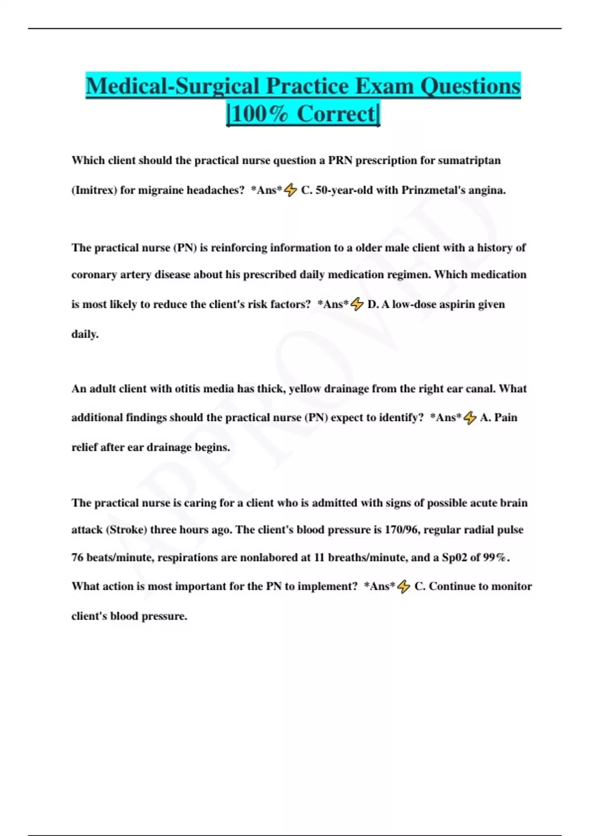 Medical-Surgical Practice Exam Questions |100% Correct| Which client should the practical nurse question a PRN prescription for sumatriptan (Imitrex) for migraine headaches? *Ans* C. 50-year-old with Prinzmetal's angina. The practical nurse (PN) is reinforcing information to a older male client with a history of coronary artery disease about his prescribed daily medication regimen. Which medication is most likely to reduce the client's risk factors? *Ans* D. A low-dose aspirin given daily. An adult client with otitis media has thick, yellow drainage from the right ear canal. What additional findings should the practical nurse (PN) expect to identify? *Ans* A. Pain relief after ear drainage begins. The practical nurse is caring for a client who is admitted with signs of possible acute brain attack (Stroke) three hours ago. The client's blood pressure is 170/96, regular radial pulse 76 beats/minute, respirations are nonlabored at 11 breaths/minute, and a Sp02 of 99%. What action is most important for the PN to implement? *Ans* C. Continue to monitor client's blood pressure. A client who was hit in the head with a baseball is admitted to the hospital for observation. Which finding requires the practical nurse (PN) to follow-up with further assessment? *Ans* D. Reports the hospital room is an office. An older female client with osteoporosis asks the practical nurse (PN) to explain why she is now 2 inches shorter than when she was younger. What information is best for the practical nurse (PN) to provide? *Ans* D. It is a combination of wear and tear and calcium loss that causes the change. A practical nurse (PN) is coordinating the care of four clients on an oncology unit. Which neutrophil count should the PN identify as a risk for a life-threatening infection in one of the clients? *Ans* A. 500/mm3. An older client who has had a cataract in the right eye for several years tells the practical nurse (PN), "Now I have lost the sight in my right eye because I waited too long for treatment." What information should the PN provide? *Ans* C. Surgery can restore vision with corrective lens implants or glasses. The practical nurse (PN) is visiting a male client with diabetes who has a new cast on his arm. The client's fingers are pale, cool, slightly swollen, and the radial pulse is strong. What should the PN do first? *Ans* D. Elevate the arm above the level of the heart.