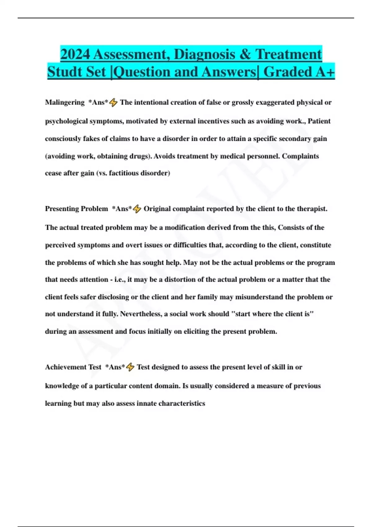 2024 Assessment, Diagnosis & Treatment Studt Set |Question and Answers| Graded A+ Malingering *Ans* The intentional creation of false or grossly exaggerated physical or psychological symptoms, motivated by external incentives such as avoiding work., Patient consciously fakes of claims to have a disorder in order to attain a specific secondary gain (avoiding work, obtaining drugs). Avoids treatment by medical personnel. Complaints cease after gain (vs. factitious disorder) Presenting Problem *Ans* Original complaint reported by the client to the therapist. The actual treated problem may be a modification derived from the this, Consists of the perceived symptoms and overt issues or difficulties that, according to the client, constitute the problems of which she has sought help. May not be the actual problems or the program that needs attention - i.e., it may be a distortion of the actual problem or a matter that the client feels safer disclosing or the client and her family may misunderstand the problem or not understand it fully. Nevertheless, a social work should "start where the client is" during an assessment and focus initially on eliciting the present problem. Achievement Test *Ans* Test designed to assess the present level of skill in or knowledge of a particular content domain. Is usually considered a measure of previous learning but may also assess innate characteristics Addiction *Ans* A term that may be applied to any substance, activity, behavior, or object that has become the major focus of a person's life to the exclusion of other activities or that has begun to harm the individual of other physically, psychologically and/or socially ADHD (Attention Deficit Hyperactivity Disorder) *Ans* It is a medial term used to involving hyperactivity, attention difficulties, and impulsiveness. In children it's 4-9 times more common in boys. Treatment is a CNS stimulant (methylphenidate) and behavioral and cognative-behavioral techniques. Agoraphobia *Ans* An anxiety disorder invovling anxiety about being in situations of places from which escape might be difficult or embarrassing or in which help might not be available if a panic attact or panic-like symptoms occur. Treatment of choice is in vivo exposure with reponse prevention (flooding). AIDS Demetia Complex *Ans* Impairment of cognitive functioning due to infections of the centeral nervous system related to HIV disease. The symptoms fluctuate from day to day severe symptoms include grandiosity, poor impulse control, memory loss, aimless wandering and disorientation. Amphetamine or Cocaine Intoxication *Ans* Symptoms include euphoria, anxiety, paranoid ideation, tachycardia, dilated pupils, perspiration, confusion and seizures