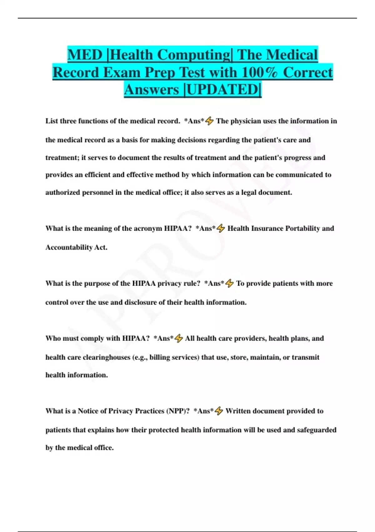 MED |Health Computing| The Medical Record Exam Prep Test with 100% Correct Answers |UPDATED| List three functions of the medical record. *Ans* The physician uses the information in the medical record as a basis for making decisions regarding the patient's care and treatment; it serves to document the results of treatment and the patient's progress and provides an efficient and effective method by which information can be communicated to authorized personnel in the medical office; it also serves as a legal document. What is the meaning of the acronym HIPAA? *Ans* Health Insurance Portability and Accountability Act. What is the purpose of the HIPAA privacy rule? *Ans* To provide patients with more control over the use and disclosure of their health information. Who must comply with HIPAA? *Ans* All health care providers, health plans, and health care clearinghouses (e.g., billing services) that use, store, maintain, or transmit health information. What is a Notice of Privacy Practices (NPP)? *Ans* Written document provided to patients that explains how their protected health information will be used and safeguarded by the medical office. List examples of when HIPAA does not require written consent for the use or disclosure of a patient's health information in the following categories: a. Treatment: b. Payment: c. Health care operations: *Ans* a. Treatment: Patient referral to a specialist, emergency care at a hospital, performance of tests on a patient by a laboratory. b. Payment: Determination of eligibility for insurance benefits, review of services provided for medical necessity, utilization review activities. c. Health care operations: Quality assessment activities, contacting of patients with information about care or treatment, employee review activities, training of health care students. What are the two most common types of medical records? *Ans* Paper-based medical records and electronic medical records are the two most common types of medical records. Briefly describe how the Health Information Technology for Economic and Clinical Health (ITECH) Act has accelerated the adoption of electronic health records. *Ans* The HITECH Act includes financial incentive payments to health care facilities and providers who adopt electronic medical records