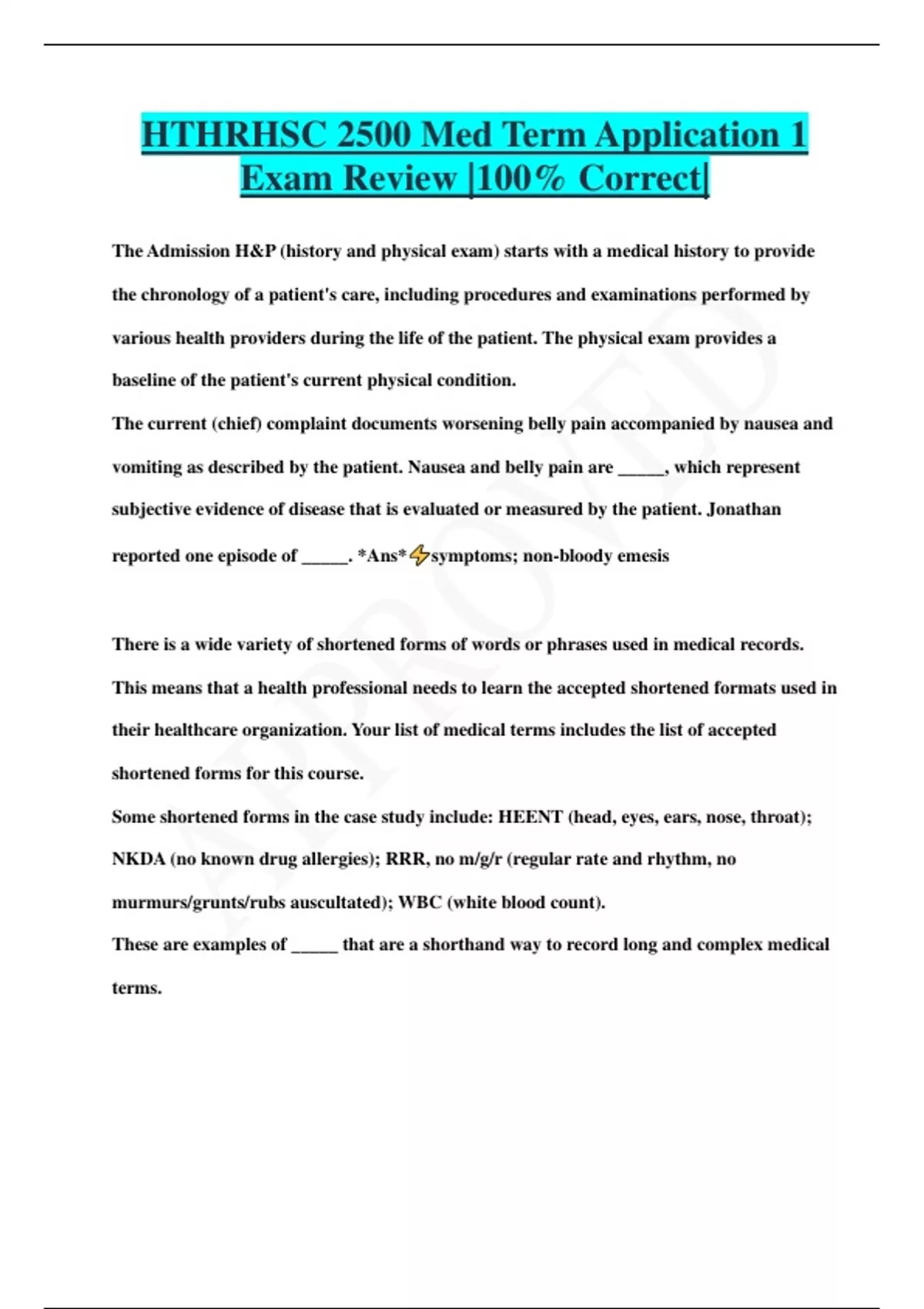 HTHRHSC 2500 Med Term Application 1 Exam Review |100% Correct| The Admission H&P (history and physical exam) starts with a medical history to provide the chronology of a patient's care, including procedures and examinations performed by various health providers during the life of the patient. The physical exam provides a baseline of the patient's current physical condition. The current (chief) complaint documents worsening belly pain accompanied by nausea and vomiting as described by the patient. Nausea and belly pain are _____, which represent subjective evidence of disease that is evaluated or measured by the patient. Jonathan reported one episode of _____. *Ans* symptoms; non-bloody emesis There is a wide variety of shortened forms of words or phrases used in medical records. This means that a health professional needs to learn the accepted shortened formats used in their healthcare organization. Your list of medical terms includes the list of accepted shortened forms for this course. Some shortened forms in the case study include: HEENT (head, eyes, ears, nose, throat); NKDA (no known drug allergies); RRR, no m/g/r (regular rate and rhythm, no murmurs/grunts/rubs auscultated); WBC (white blood count). These are examples of _____ that are a shorthand way to record long and complex medical terms. This patient's pain localized to which area of the abdomen? (You will be learning about anatomic reference systems in Chapter 2.) *Ans* abbreviations; right lower quadrant (RLQ) The physician conducts the examination and orders tests which provide objective evidence of the disease that can be evaluated. This is a sign of the condition. Select all the sign(s) from the list below that were reported in the medical record, even if the patient did not have them. [Check all the apply.] *Ans* cyanosis edema 101.4 temperature The physician documents that the patient has acute appendicitis because this condition has a/an _______________________. *Ans* rapid onset and a severe course with a relatively short duration The physical examination of the abdomen, laboratory data, and diagnostic studies are the methods to determine which one of several diseases can be produc