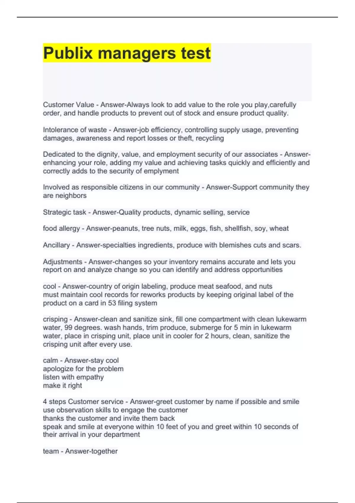 Publix managers test Customer Value - Answer-Always look to add value to the role you play,carefully order, and handle products to prevent out of stock and ensure product quality. Intolerance of waste - Answer-job efficiency, controlling supply usage, preventing damages, awareness and report losses or theft, recycling Dedicated to the dignity, value, and employment security of our associates - Answer-enhancing your role, adding my value and achieving tasks quickly and efficiently and correctly adds to the security of emplyment Involved as responsible citizens in our community - Answer-Support community they are neighbors Strategic task - Answer-Quality products, dynamic selling, service food allergy - Answer-peanuts, tree nuts, milk, eggs, fish, shellfish, soy, wheat Ancillary - Answer-specialties ingredients, produce with blemishes cuts and scars. Adjustments - Answer-changes so your inventory remains accurate and lets you report on and analyze change so you can identify and address opportunities cool - Answer-country of origin labeling, produce meat seafood, and nuts must maintain cool records for reworks products by keeping original label of the product on a card in 53 filing system crisping - Answer-clean and sanitize sink, fill one compartment with clean lukewarm water, 99 degrees. wash hands, trim produce, submerge for 5 min in lukewarm water, place in crisping unit, place unit in cooler for 2 hours, clean, sanitize the crisping unit after every use. calm - Answer-stay cool apologize for the problem listen with empathy make it right 4 steps Customer service - Answer-greet customer by name if possible and smile use observation skills to engage the customer thanks the customer and invite them back speak and smile at everyone within 10 feet of you and greet within 10 seconds of their arrival in your department team - Answer-together everyone
