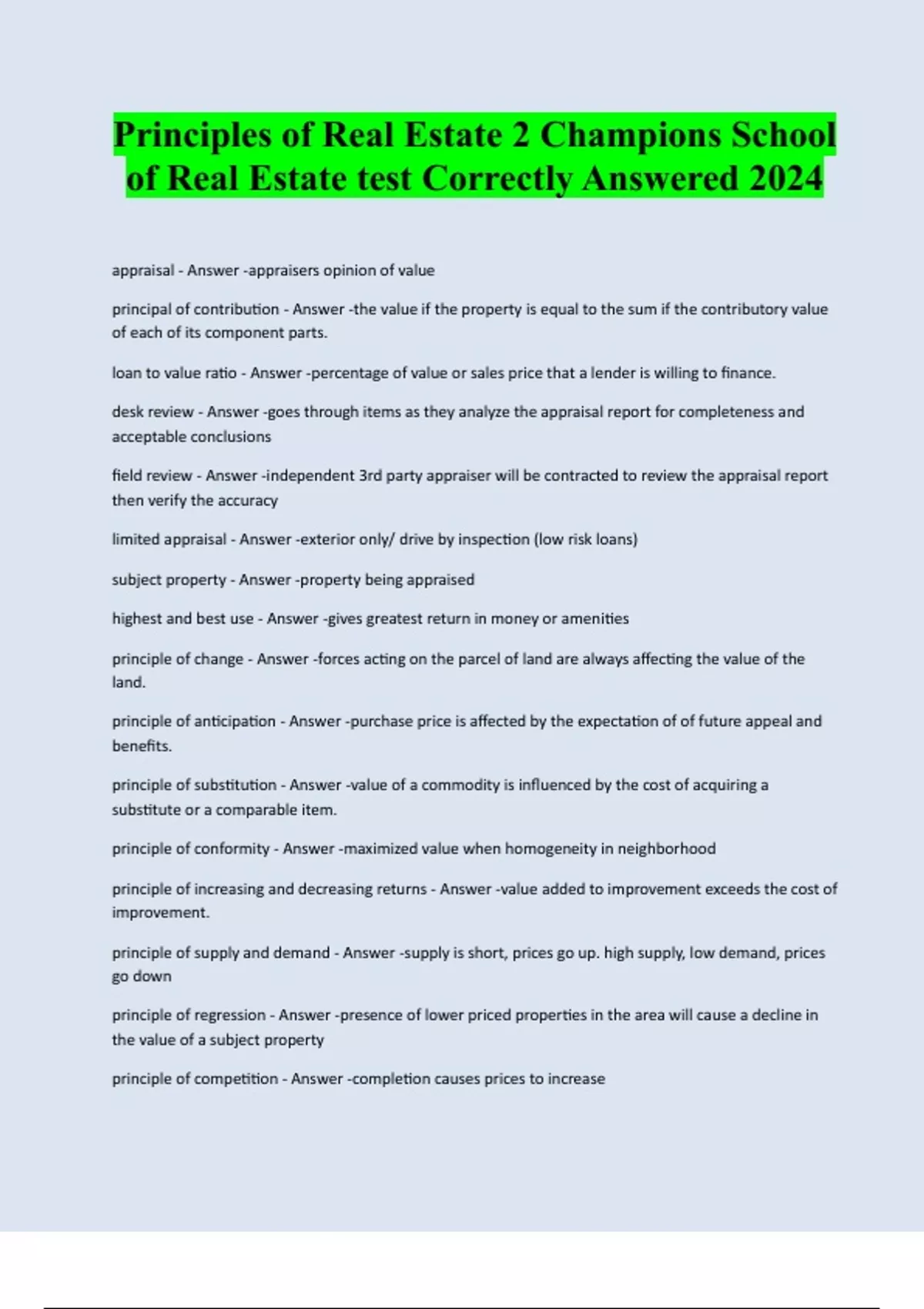 Principles of Real Estate 2 Champions School of Real Estate test Correctly Answered 2024 appraisal - Answer -appraisers opinion of value principal of contribution - Answer -the value if the property is equal to the sum if the contributory value of each of its component parts. loan to value ratio - Answer -percentage of value or sales price that a lender is willing to finance. desk review - Answer -goes through items as they analyze the appraisal report for completeness and acceptable conclusions field review - Answer -independent 3rd party appraiser will be contracted to review the appraisal report then verify the accuracy limited appraisal - Answer -exterior only/ drive by inspection (low risk loans) subject property - Answer -property being appraised highest and best use - Answer -gives greatest return in money or amenities principle of change - Answer -forces acting on the parcel of land are always affecting the value of the land. principle of anticipation - Answer -purchase price is affected by the expectation of of future appeal and benefits. principle of substitution - Answer -value of a commodity is influenced by the cost of acquiring a substitute or a comparable item. principle of conformity - Answer -maximized value when homogeneity in neighborhood principle of increasing and decreasing returns - Answer -value added to improvement exceeds the cost of improvement. principle of supply and demand - Answer -supply is short, prices go up. high supply, low demand, prices go down principle of regression - Answer -presence of lower priced properties in the area will cause a decline in the value of a subject property principle of competition - Answer -completion causes prices to increasemarket value - Answer -most reasonable price a property should bring in a competitive open market. ad valorem - Answer -according to value depreciation - Answer -loss in value due to any cause assessed value - Answer -for tax purposes- determined by tax authority- not reliable estimate of market value chronological age - Answer -physical number of years sales comparison approach "market data approach" - Answer -compares subject property charectoristcs with those of comparable properties which have recently sold functional obsolescence - Answer -loss in value by factors outside sales comparison - Answer -price a wiling seller will sell for & price willing buyer will buy. cost approach to value - Answer -estimate of value based on current construction costs.