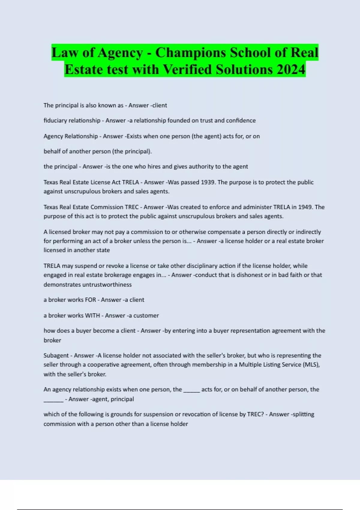 Law of Agency - Champions School of Real Estate test with Verified Solutions 2024 The principal is also known as - Answer -client fiduciary relationship - Answer -a relationship founded on trust and confidence Agency Relationship - Answer -Exists when one person (the agent) acts for, or on behalf of another person (the principal). the principal - Answer -is the one who hires and gives authority to the agent Texas Real Estate License Act TRELA - Answer -Was passed 1939. The purpose is to protect the public against unscrupulous brokers and sales agents. Texas Real Estate Commission TREC - Answer -Was created to enforce and administer TRELA in 1949. The purpose of this act is to protect the public against unscrupulous brokers and sales agents. A licensed broker may not pay a commission to or otherwise compensate a person directly or indirectly for performing an act of a broker unless the person is... - Answer -a license holder or a real estate broker licensed in another state TRELA may suspend or revoke a license or take other disciplinary action if the license holder, while engaged in real estate brokerage engages in... - Answer -conduct that is dishonest or in bad faith or that demonstrates untrustworthiness a broker works FOR - Answer -a client a broker works WITH - Answer -a customer how does a buyer become a client - Answer -by entering into a buyer representation agreement with the broker Subagent - Answer -A license holder not associated with the seller's broker, but who is representing the seller through a cooperative agreement, often through membership in a Multiple Listing Service (MLS), with the seller's broker. An agency relationship exists when one person, the _____ acts for, or on behalf of another person, the ______ - Answer -agent, principal which of the following is grounds for suspension or revocation of license by TREC? - Answer -splitting commission with a person other than a license holderThe commission can deny licensure to an applicant based on the applicant's _______________________ - Answer -moral character Ostensible Agency - Answer -exists when actions lead another person to assume that one is an agent. Agency by Ratification - Answer -Occurs when an agent acts without prior authorization, and the principal, upon learning of this action, accepts it. agency coupled with an interest - Answer -When a broker is the owner of a property that is being sold, or when a broker is interested in buying a property, we have agency coupled with an interest Agency Authority - Answer -or rights, may also be a result of "the norm", or what is considered customary in the business Implied Authority - Answer -an agent's authority to do things not specifically authorized in order to carry out express authority Fiduciaries - Answer -are held to the highest amount of good faith, are required to exclude all selfis