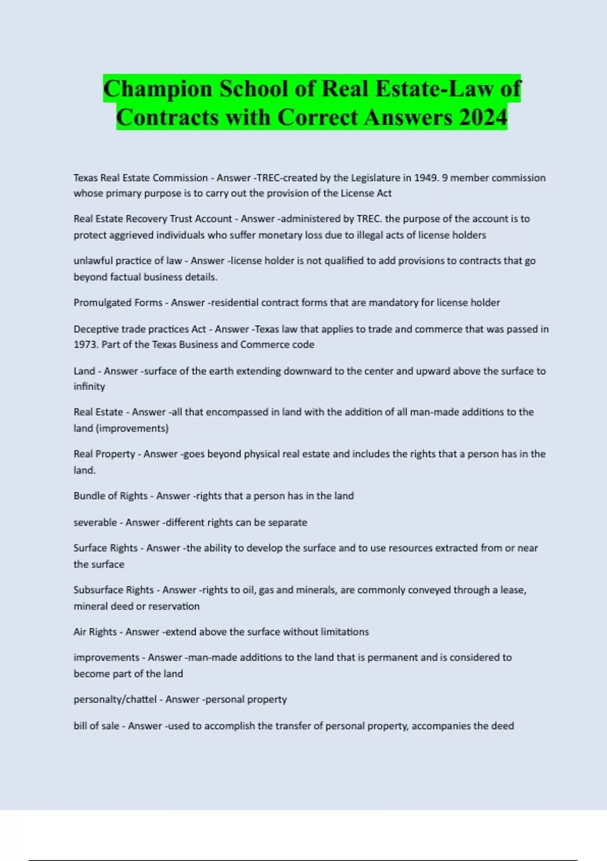 Champion School of Real Estate-Law of Contracts with Correct Answers 2024 Texas Real Estate Commission - Answer -TREC-created by the Legislature in 1949. 9 member commission whose primary purpose is to carry out the provision of the License Act Real Estate Recovery Trust Account - Answer -administered by TREC. the purpose of the account is to protect aggrieved individuals who suffer monetary loss due to illegal acts of license holders unlawful practice of law - Answer -license holder is not qualified to add provisions to contracts that go beyond factual business details. Promulgated Forms - Answer -residential contract forms that are mandatory for license holder Deceptive trade practices Act - Answer -Texas law that applies to trade and commerce that was passed in 1973. Part of the Texas Business and Commerce code Land - Answer -surface of the earth extending downward to the center and upward above the surface to infinity Real Estate - Answer -all that encompassed in land with the addition of all man-made additions to the land (improvements) Real Property - Answer -goes beyond physical real estate and includes the rights that a person has in the land. Bundle of Rights - Answer -rights that a person has in the land severable - Answer -different rights can be separate Surface Rights - Answer -the ability to develop the surface and to use resources extracted from or near the surface Subsurface Rights - Answer -rights to oil, gas and minerals, are commonly conveyed through a lease, mineral deed or reservation Air Rights - Answer -extend above the surface without limitations improvements - Answer -man-made additions to the land that is permanent and is considered to become part of the land personalty/chattel - Answer -personal property bill of sale - Answer -used to accomplish the transfer of personal property, accompanies t