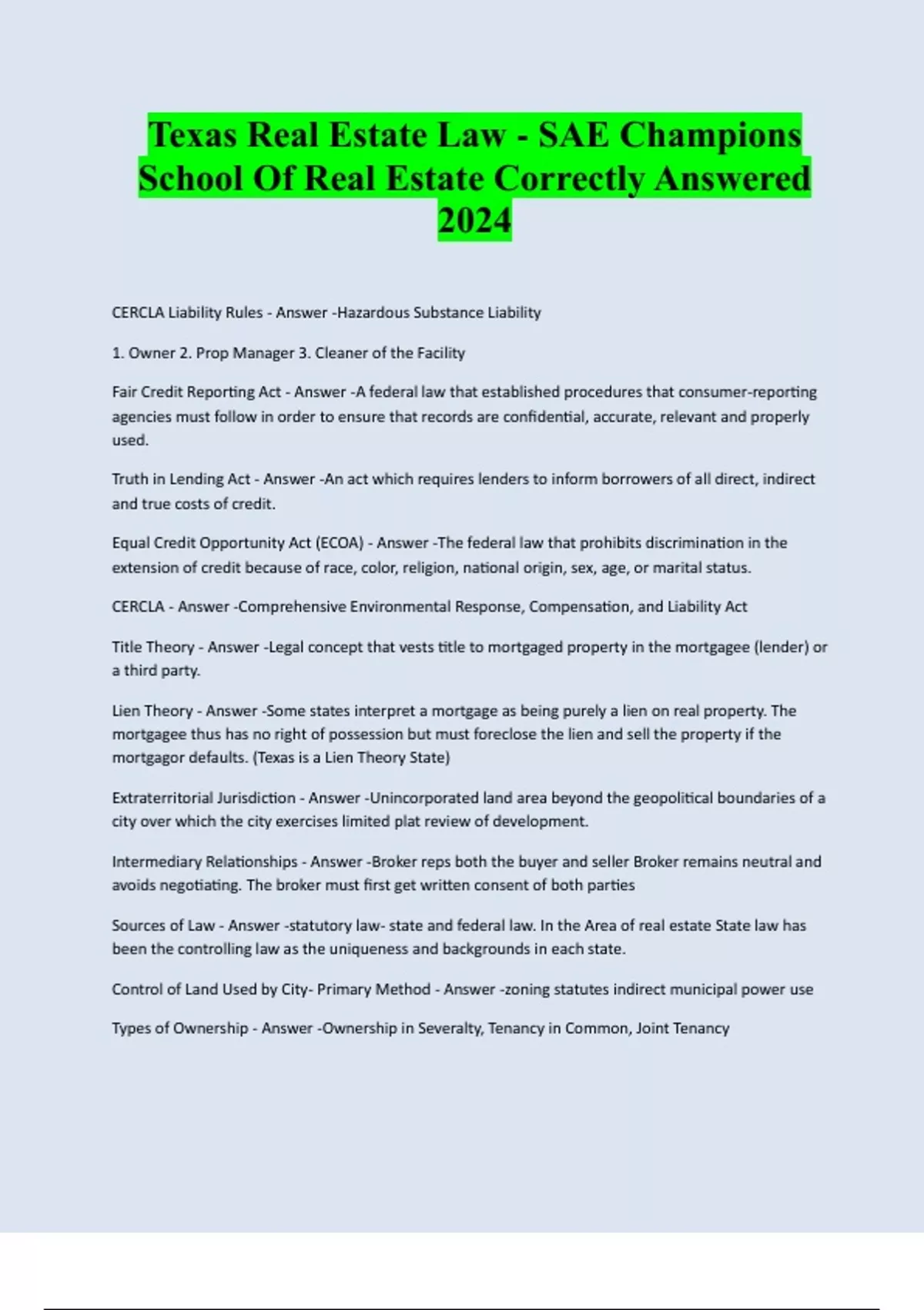 Texas Real Estate Law - SAE Champions School Of Real Estate Correctly Answered 2024 CERCLA Liability Rules - Answer -Hazardous Substance Liability 1. Owner 2. Prop Manager 3. Cleaner of the Facility Fair Credit Reporting Act - Answer -A federal law that established procedures that consumer-reporting agencies must follow in order to ensure that records are confidential, accurate, relevant and properly used. Truth in Lending Act - Answer -An act which requires lenders to inform borrowers of all direct, indirect and true costs of credit. Equal Credit Opportunity Act (ECOA) - Answer -The federal law that prohibits discrimination in the extension of credit because of race, color, religion, national origin, sex, age, or marital status. CERCLA - Answer -Comprehensive Environmental Response, Compensation, and Liability Act Title Theory - Answer -Legal concept that vests title to mortgaged property in the mortgagee (lender) or a third party. Lien Theory - Answer -Some states interpret a mortgage as being purely a lien on real property. The mortgagee thus has no right of possession but must foreclose the lien and sell the property if the mortgagor defaults. (Texas is a Lien Theory State) Extraterritorial Jurisdiction - Answer -Unincorporated land area beyond the geopolitical boundaries of a city over which the city exercises limited plat review of development. Intermediary Relationships - Answer -Broker reps both the buyer and seller Broker remains neutral and avoids negotiating. The broker must first get written consent of both parties Sources of Law - Answer -statutory law- state and federal law. In the Area of real estate State law has been the controlling law as the uniqueness and backgrounds in each state. Control of Land Used by City- Primary Method - Answer -zoning statutes indirect municipal power use Types of Ownership - Answer -Ownership in Severalty, Tenancy in Common, Joint TenancyTexas Homestead - Answer -Texas Homestead law