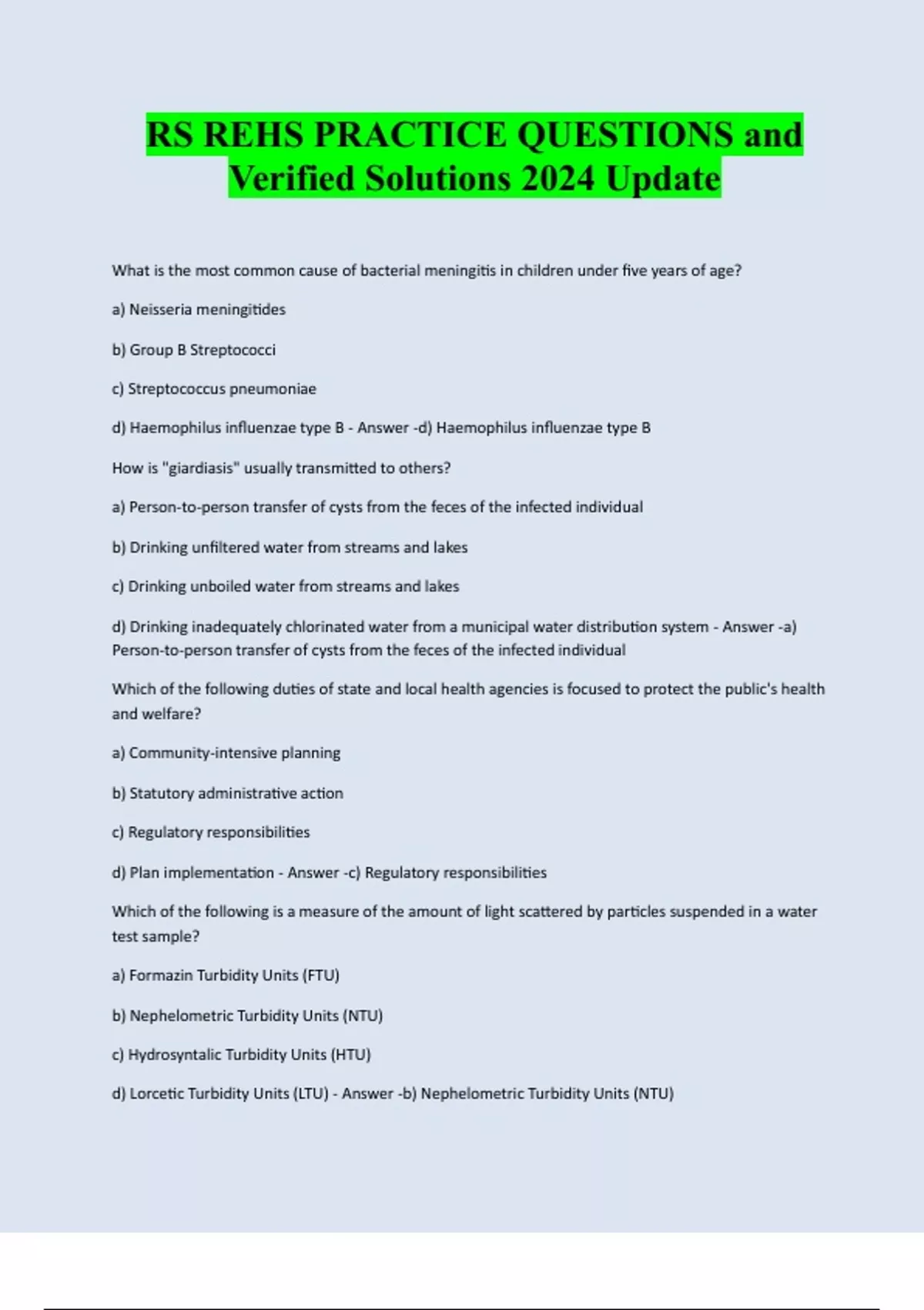 RS REHS PRACTICE QUESTIONS and Verified Solutions 2024 Update What is the most common cause of bacterial meningitis in children under five years of age? a) Neisseria meningitides b) Group B Streptococci c) Streptococcus pneumoniae d) Haemophilus influenzae type B - Answer -d) Haemophilus influenzae type B How is "giardiasis" usually transmitted to others? a) Person-to-person transfer of cysts from the feces of the infected individual b) Drinking unfiltered water from streams and lakes c) Drinking unboiled water from streams and lakes d) Drinking inadequately chlorinated water from a municipal water distribution system - Answer -a) Person-to-person transfer of cysts from the feces of the infected individual Which of the following duties of state and local health agencies is focused to protect the public's health and welfare? a) Community-intensive planning b) Statutory administrative action c) Regulatory responsibilities d) Plan implementation - Answer -c) Regulatory responsibilities Which of the following is a measure of the amount of light scattered by particles suspended in a water test sample? a) Formazin Turbidity Units (FTU) b) Nephelometric Turbidity Units (NTU) c) Hydrosyntalic Turbidity Units (HTU) d) Lorcetic Turbidity Units (LTU) - Answer -b) Nephelometric Turbidity Units (NTU)What is an epidemic? a) The constant presence of a disease within a community or region b) The presence of an infectious agent on a body surface c) The presence of infection in a host without clear, recognizable clinical symptoms d) The occurrence in a community or region of cases of a