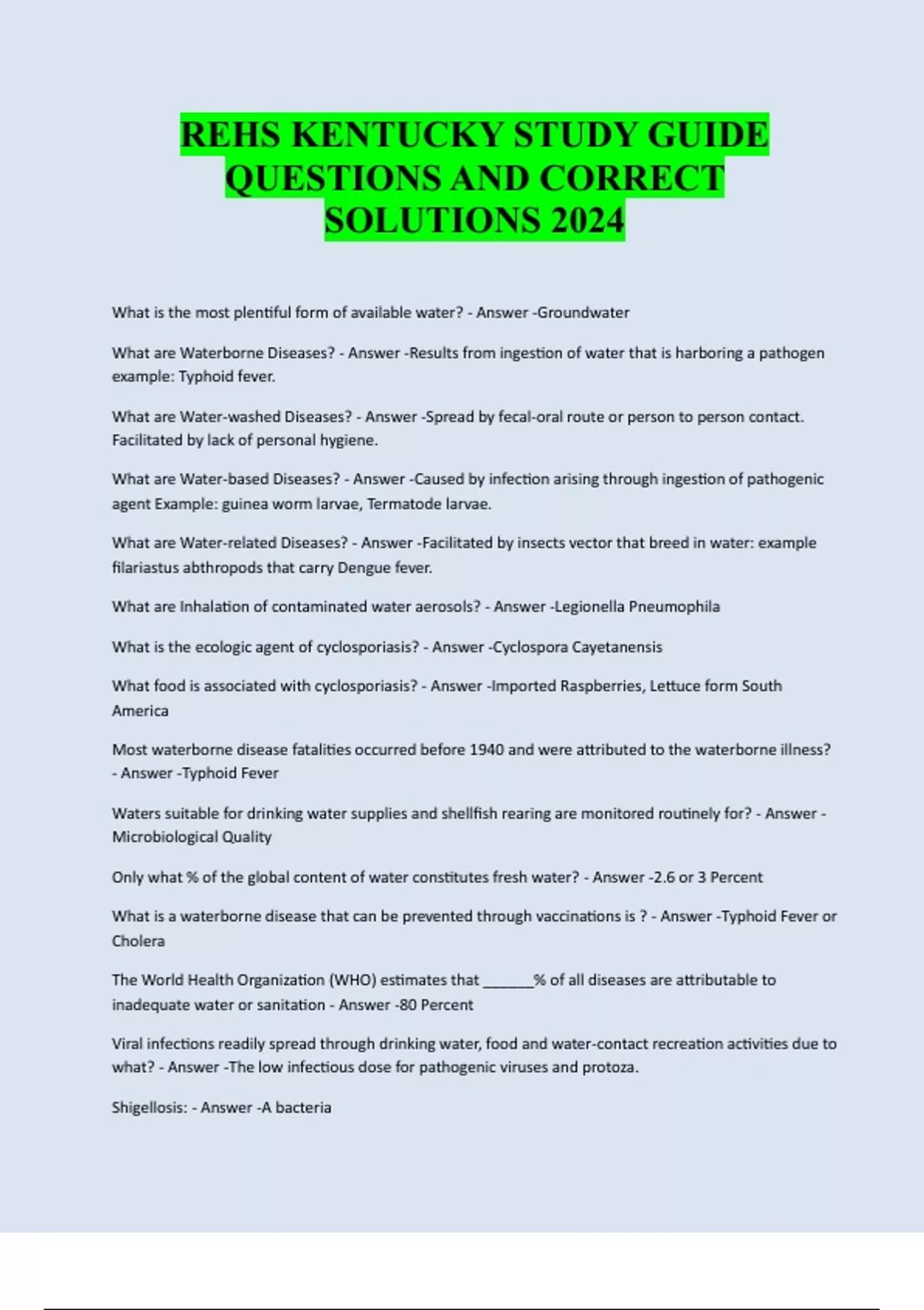 REHS KENTUCKY STUDY GUIDE QUESTIONS AND CORRECT SOLUTIONS 2024 What is the most plentiful form of available water? - Answer -Groundwater What are Waterborne Diseases? - Answer -Results from ingestion of water that is harboring a pathogen example: Typhoid fever. What are Water-washed Diseases? - Answer -Spread by fecal-oral route or person to person contact. Facilitated by lack of personal hygiene. What are Water-based Diseases? - Answer -Caused by infection arising through ingestion of pathogenic agent Example: guinea worm larvae, Termatode larvae. What are Water-related Diseases? - Answer -Facilitated by insects vector that breed in water: example filariastus abthropods that carry Dengue fever. What are Inhalation of contaminated water aerosols? - Answer -Legionella Pneumophila What is the ecologic agent of cyclosporiasis? - Answer -Cyclospora Cayetanensis What food is associated with cyclosporiasis? - Answer -Imported Raspberries, Lettuce form South America Most waterborne disease fatalities occurred before 1940 and were attributed to the waterborne illness? - Answer -Typhoid Fever Waters suitable for drinking water supplies and shellfish rearing are monitored routinely for? - Answer - Microbiological Quality Only what % of the global content of water constitutes fresh water? - Answer -2.6 or 3 Percent What is a waterborne disease that can be prevented through vaccinations is ? - Answer -Typhoid Fever or Cholera The World Health Organization (WHO) estimates that ______% of all diseases are attributable to inadequate water or sanitation - Answer -80 Percent Viral infections readily spread through drinking water, food and water-contact recreation activities due to what? - Answer -The low infectious dose for pathogenic viruses and protoza. Shigellosis: - Answer -A bacteriaWhat is the specific agent for shingellosis? - Answer -Genus shingella Example: flexneri, sonnei, boydlii, and dysenteriae What is the Reservoir for shingellosis? - Answer -Feces of carriers and infected persons What are the symptoms of shingellosis? - Answer -Acute onset with diarrhea, fever, tenesmus, frequent stools containing blood and mucus. What is the incubation for shingellosis? - Answer -1-7 days, usually less than 4 day