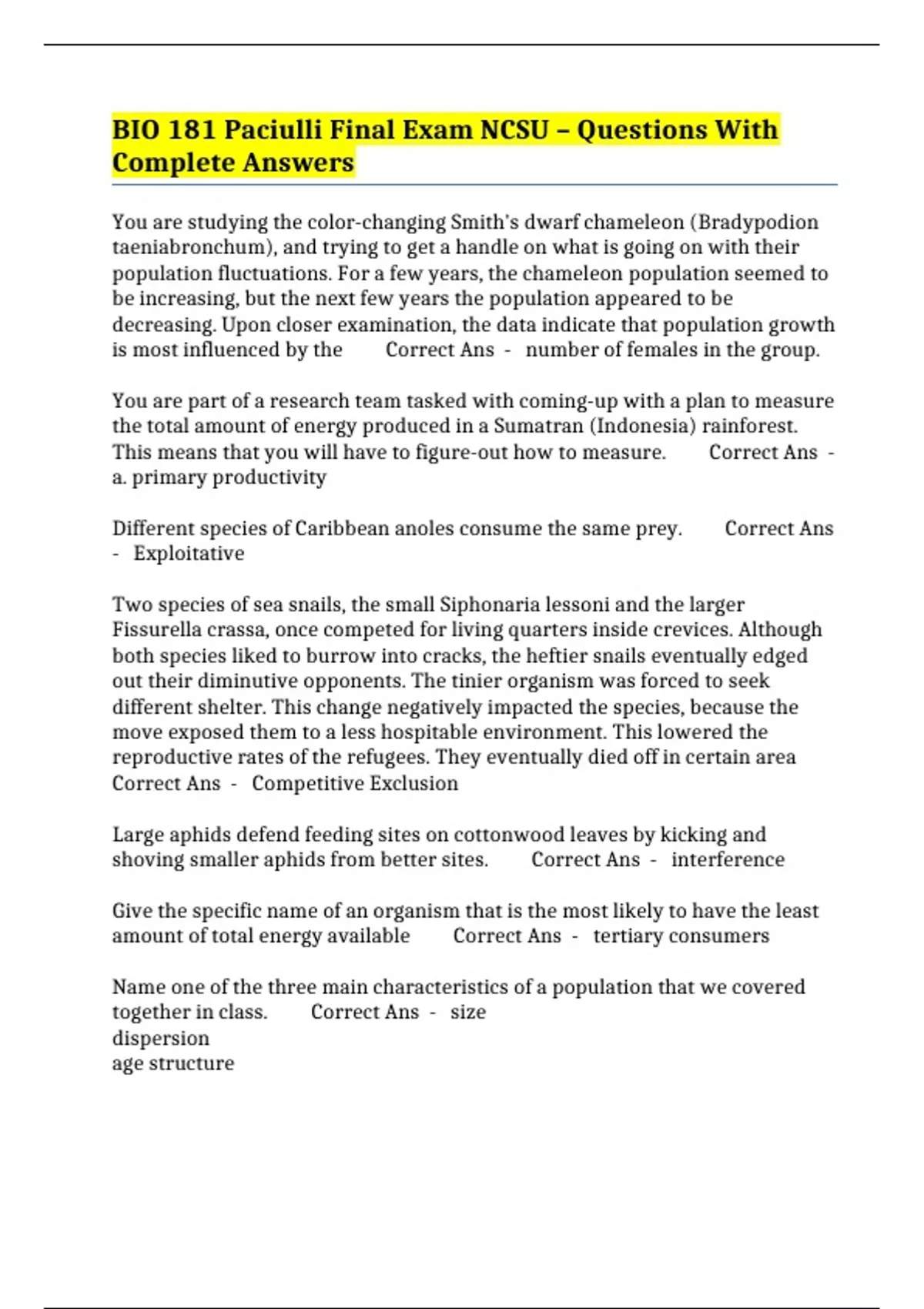 BIO 181 Paciulli Final Exam NCSU – Questions With Complete Answers