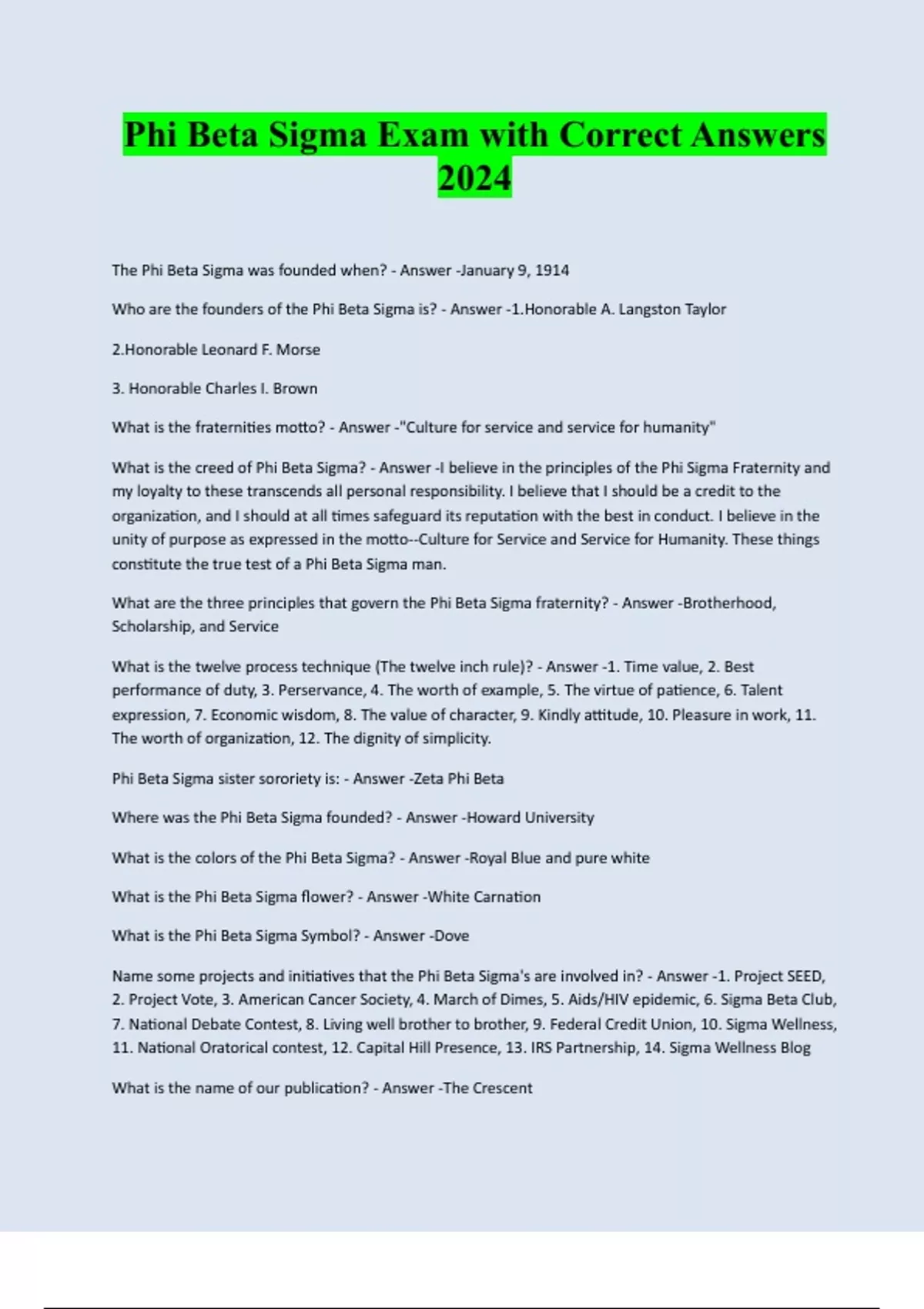 Phi Beta Sigma Exam with Correct Answers 2024 The Phi Beta Sigma was founded when? - Answer -January 9, 1914 Who are the founders of the Phi Beta Sigma is? - Answer -1.Honorable A. Langston Taylor 2.Honorable Leonard F. Morse 3. Honorable Charles I. Brown What is the fraternities motto? - Answer -"Culture for service and service for humanity" What is the creed of Phi Beta Sigma? - Answer -I believe in the principles of the Phi Sigma Fraternity and my loyalty to these transcends all personal responsibility. I believe that I should be a credit to the organization, and I should at all times safeguard its reputation with the best in conduct. I believe in the unity of purpose as expressed in the motto--Culture for Service and Service for Humanity. These things constitute the true test of a Phi Beta Sigma man. What are the three principles that govern the Phi Beta Sigma fraternity? - Answer -Brotherhood, Scholarship, and Service What is the twelve process technique (The twelve inch rule)? - Answer -1. Time value, 2. Best performance of duty, 3. Perservance, 4. The worth of example, 5. The virtue of patience, 6. Talent expression, 7. Economic wisdom, 8. The value of character, 9. Kindly attitude, 10. Pleasure in work, 11. The worth of organization, 12. The dignity of simplicity. Phi Beta Sigma sister sororiety is: - Answer -Zeta Phi Beta Where was the Phi Beta Sigma founded? - Answer -Howard University What is the colors of the Phi Beta Sigma? - Answer -Royal Blue and pure white What is the Phi Beta Sigma flower? - Answer -White Carnation What is the Phi Beta Sigma Symbol? - Answer -Dove Name some projects and initiatives that the Phi Beta Sigma's are involved in? - Answer -1. Project SEED, 2. Project Vote, 3. American Cancer Society, 4. March of Dimes, 5. Aids/HIV