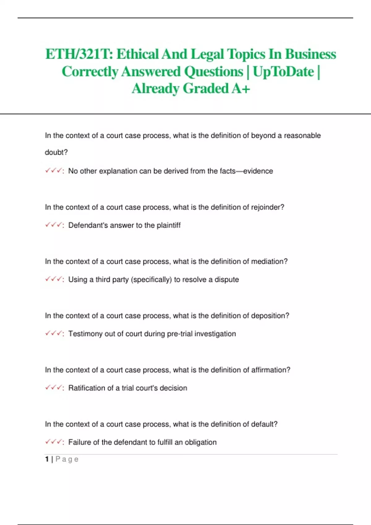 In the context of a court case process, what is the definition of beyond a reasonable doubt? : No other explanation can be derived from the facts—evidence In the context of a court case process, what is the definition of rejoinder? : Defendant's answer to the plaintiff In the context of a court case process, what is the definition of mediation? : Using a third party (specifically) to resolve a dispute In the context of a court case process, what is the definition of deposition? : Testimony out of court during pre-trial investigation In the context of a court case process, what is the definition of affirmation? : Ratification of a trial court's decision In the context of a court case process, what is the definition of default? : Failure of the defendant to fulfill an obligation 2 | P a g e Marcus lives in New York but regularly does business in Texas where his company has most of its business contacts. While traveling to Texas from New York, Marcus is sued by the hotel he stays at in Mississippi after he negligently destroys hotel property. Where would jurisdiction most likely fall under long-arm state statutes? : Mississippi If the goal is to determine procedures for changing the law, which of the following is the best tool that matches that goal? : Provide legislative processe