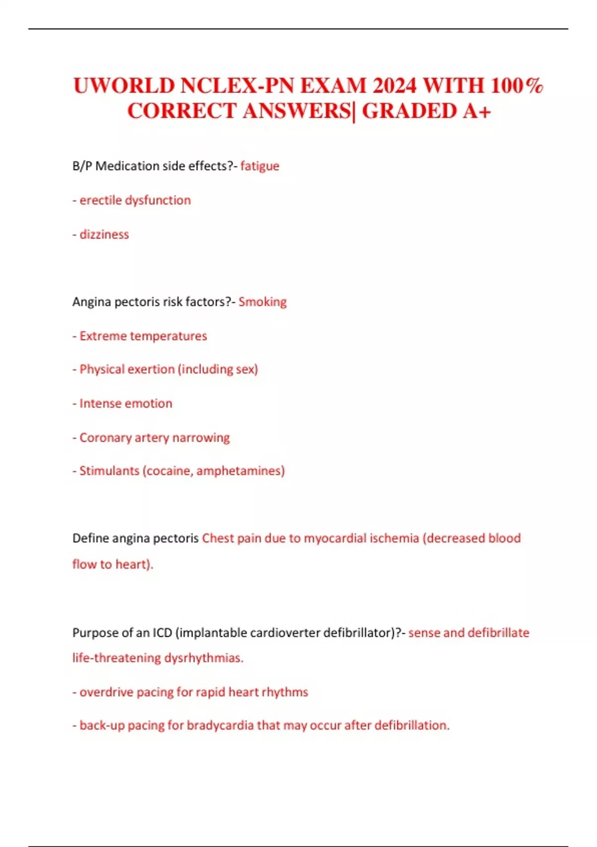 UWORLD NCLEX-PN EXAM 2024 WITH 100% CORRECT ANSWERS| GRADED A+