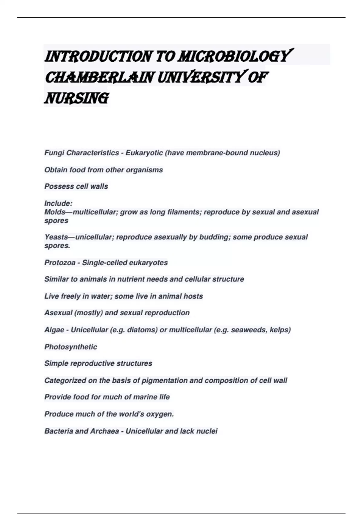 Introduction to Microbiology Chamberlain university of nursing Fungi Characteristics - Eukaryotic (have membrane-bound nucleus) Obtain food from other organisms Possess cell walls Include: Molds—multicellular; grow as long filaments; reproduce by sexual and asexual spores Yeasts—unicellular; reproduce asexually by budding; some produce sexual spores. Protozoa - Single-celled eukaryotes Similar to animals in nutrient needs and cellular structure Live freely in water; some live in animal hosts Asexual (mostly) and sexual reproduction Algae - Unicellular (e.g. diatoms) or multicellular (e.g. seaweeds, kelps) Photosynthetic Simple reproductive structures Categorized on the basis of pigmentation