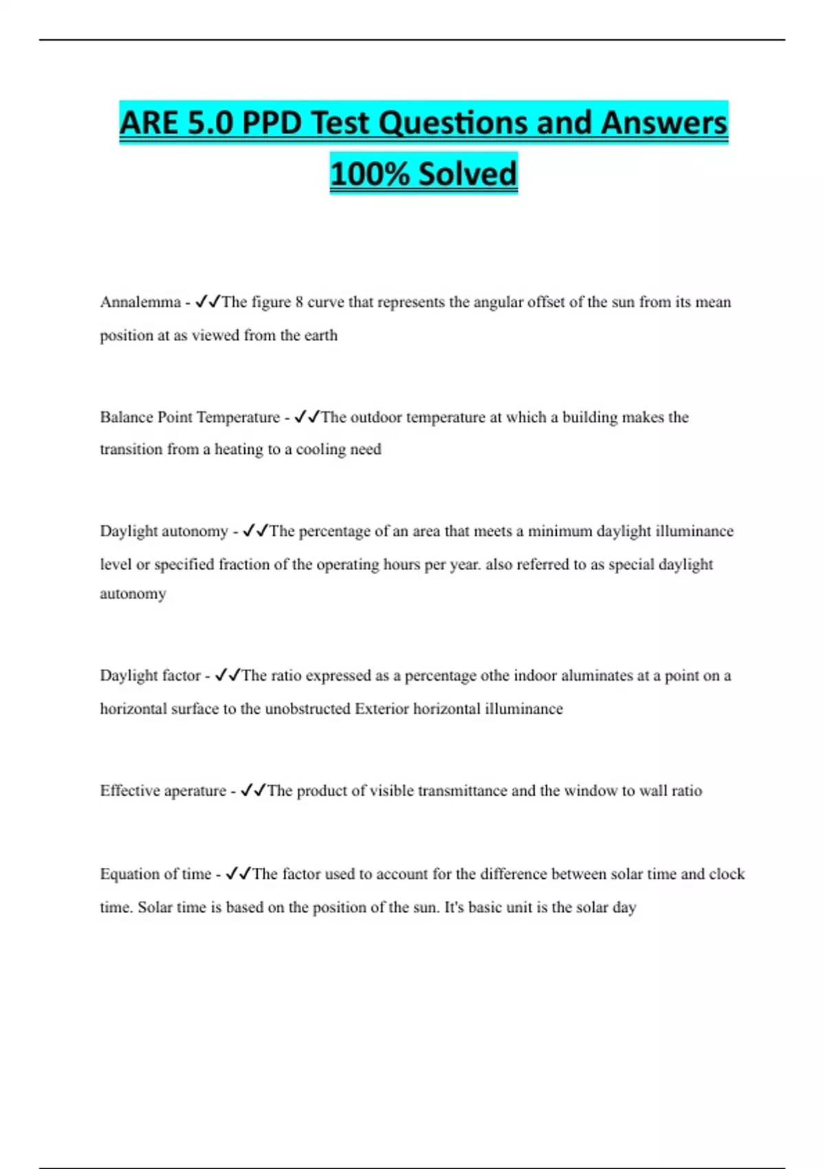 ARE 5.0 PPD Test Questions and Answers 100% Solved Annalemma - The figure 8 curve that represents the angular offset of the sun from its mean position at as viewed from the earth Balance Point Temperature - The outdoor temperature at which a building makes the transition from a heating to a cooling need Daylight autonomy - The percentage of an area that meets a minimum daylight illuminance level or specified fraction of the operating hours per year. also referred to as special daylight autonomy Daylight factor - The ratio expressed as a percentage othe indoor aluminates at a point on a horizontal surface to the unobstructed Exterior horizontal illuminance