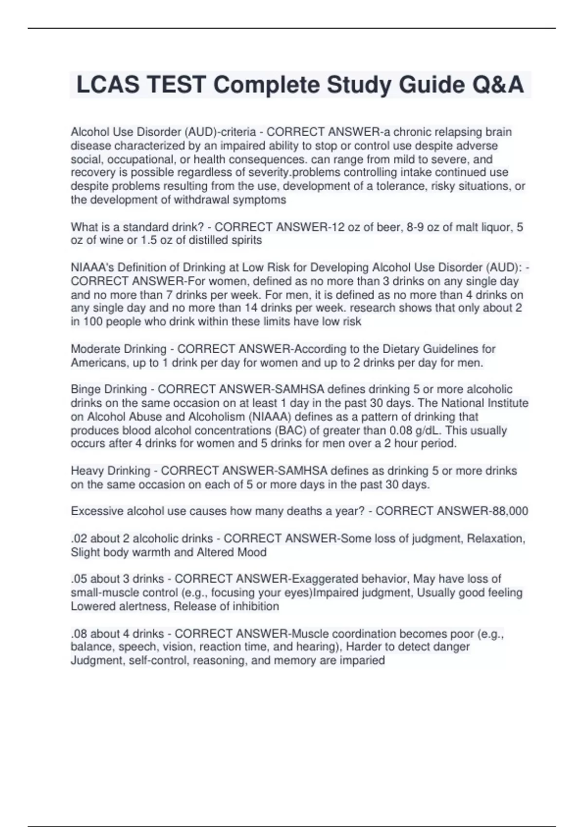 LCAS TEST Complete Study Guide Q&A Alcohol Use Disorder (AUD)-criteria - CORRECT ANSWER-a chronic relapsing brain disease characterized by an impaired ability to stop or control use despite adverse social, occupational, or health consequences. can range from mild to severe, and recovery is possible regardless of ems controlling intake continued use despite problems resulting from the use, development of a tolerance, risky situations, or the development of withdrawal symptoms What is a standard drink? - CORRECT ANSWER-12 oz of beer, 8-9 oz of malt liquor, 5 oz of wine or 1.5 oz of distilled spirits NIAAA's Definition of Drinking at Low Risk for Developing Alcohol Use Disorder (AUD): - CORRECT ANSWER-For women, defined as no more than 3 drinks on any single day and no more than 7 drinks per week. For men, it is defined as no more than 4 drinks on any single day and no more than 14 drinks per week. research shows that only about 2 in 100 people who drink within these limits have low risk Moderate Drinking - CORRECT ANSWER-According to the Dietary Guidelines for Americans, up to 1 drink per day for women and up to 2 drinks per day for men. Binge Drinking - CORRECT ANSWER-SAMHSA defines drinking 5 or more alcoholic drinks on the same occasion on at least 1 day in the past 30 days. The National Institute on Alcohol Abuse and Alcoholism (NIAAA) defines as a pattern of drinking that produces blood alcohol concentrations (BAC) of greater than 0.08 g/dL. This usually occurs after 4 drinks for women and 5 drinks for men over a 2 hour period. Heavy Drinking - CORRECT ANSWER-SAMHSA defines as drinking 5 or more drinks on the same occasion on each of 5 or more days in the past 30 days. Excessive alcohol use causes how many deaths a year? - CORRECT ANSWER-88,000 .02 about 2 alcoholic drinks - CORRECT ANSWER-Some loss of judgment, Relaxation, Slight body warmth and Altered Mood .05 about 3 drinks - CORRECT ANSWER-Exaggerated behavior, May have loss of small-muscle control (e.g., focusing your eyes)Impaired judgment, Usually good feeling Lowered alertness, Release of inhibition .08 about 4 drinks - CORRECT ANSWER-Muscle coordination becomes poor (e.g., balance, speech, vision, reaction time, and hearing), Harder to detect danger Judgment, self-control, reasoning, and memory are imparied .10 about 5 drinks - CORRECT ANSWER-Clear deterioration of reaction time and control, Slurred speech, poor coordination, and slowed thinking .15 about 7 drinks - CORRECT ANSWER-Far less muscle control than normal Vomiting may occur (unless this level is reached slowly or a person has developed a tolerance for alcohol), Major loss of balance How is BAC assesed? - CORRECT ANSWER-can be assessed accurately with a breath test or breathalyzer. To calculate the amount of alcohol in the bloodstream is measured in mg of alcohol per 100 ml of blood. It is usually expressed as a decimal, such as 0.08 or 0.15. For example, a BAC o