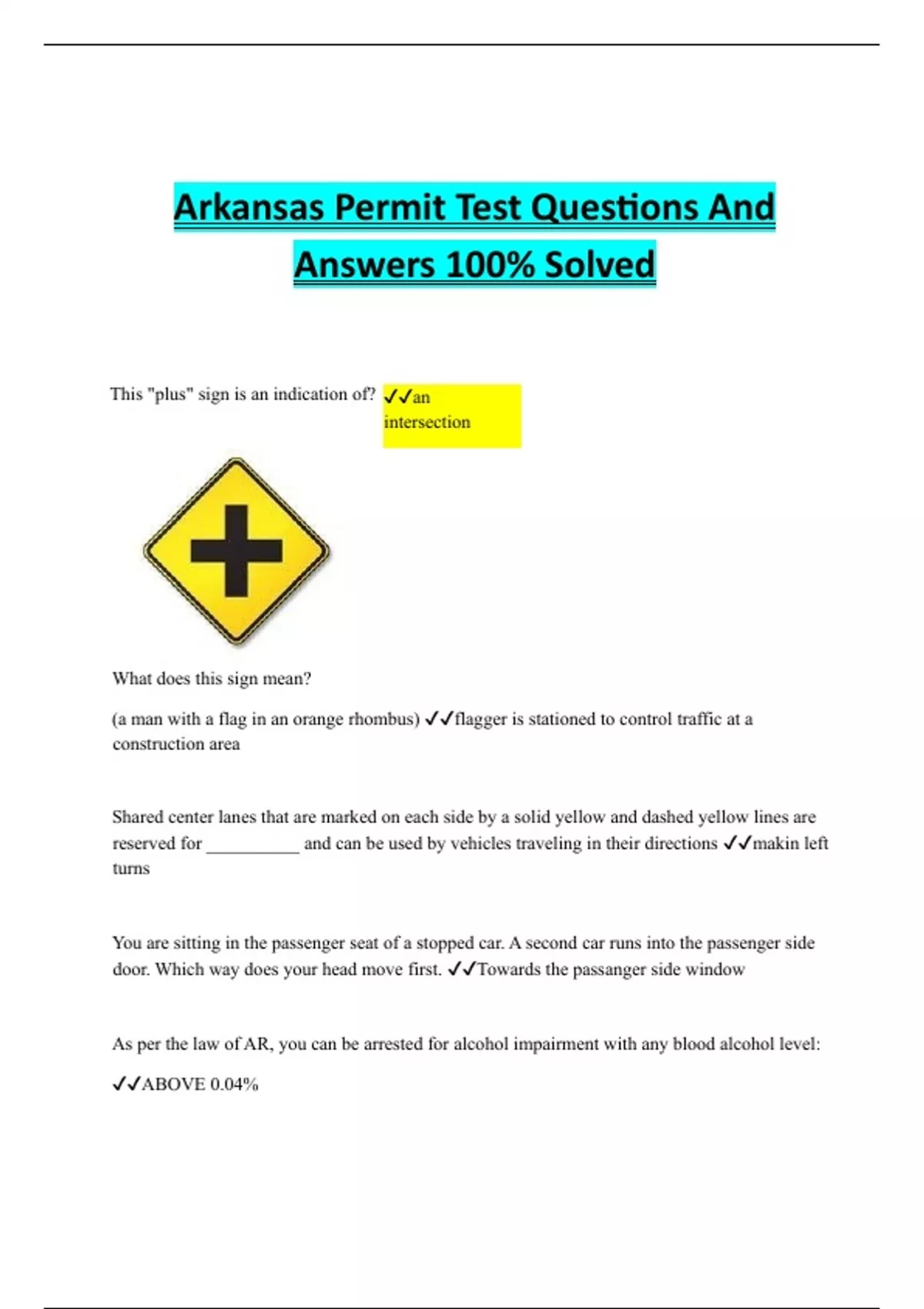 Arkansas Permit Test Questions And Answers 100% Solved This "plus" sign is an indication of? an intersection What does this sign mean? (a man with a flag in an orange rhombus) flagger is stationed to control traffic at a construction area Shared center lanes that are marked on each side by a solid yellow and dashed yellow lines are reserved for __________ and can be used by vehicles traveling in their directions makin left turns You are sitting in the passenger seat of a stopped car. A second car runs into the passenger side door. Which way does your head move first. Towards the passanger side window As per the law of AR, you can be arrested for alcohol impairment with any blood alcohol level: ABOVE 0.04%