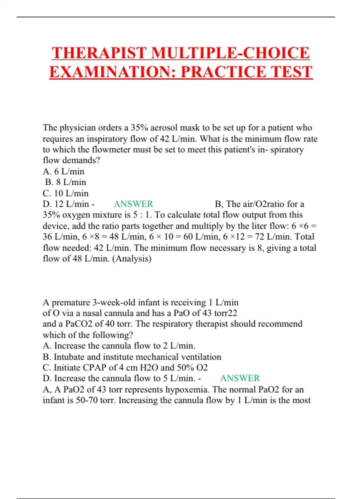 THERAPIST MULTIPLE-CHOICE EXAMINATION: PRACTICE TEST The physician orders a 35% aerosol mask to be set up for a patient who requires an inspiratory flow of 42 L/min. What is the minimum flow rate to which the flowmeter must be set to meet this patient's in- spiratory flow demands? A. 6 L/min B. 8 L/min C. 10 L/min D. 12 L/min - ANSWER B, The air/O2ratio for a 35% oxygen mixture is 5 : 1. To calculate total flow output from this device, add the ratio parts together and multiply by the liter flow: 6 ×6 = 36 L/min, 6 ×8 = 48 L/min, 6 × 10 = 60 L/min, 6 ×12 = 72 L/min. Total flow needed: 42 L/min. The minimum flow necessary is 8, giving a total flow of 48 L/min. (Analysis) A premature 3-week-old infant is receiving 1 L/min of O via a nasal cannula and has a PaO of 43 torr22 and a PaCO2 of 40 torr. The respiratory therapist should recommend which of the following? A. Increase the cannula flow to 2 L/min. B. Intubate and institute mechanical ventilation C. Initiate CPAP of 4 cm H2O and 50% O2 D. Increase the cannula flow to 5 L/min. - ANSWER A, A PaO2 of 43 torr represents hypoxemia. The normal PaO2 for an infant is 50-70 torr. Increasing the cannula flow by 1 L/min is the most appropriate choice to return the PaO2 to normal. With a normal PaCO2 of 40 torr, mechanical ventilation is not indicated. (Analysis) what is normal PaO2 for infant ? - ANSWER 50-70 torr. A patient arrives in the emergency department after being pulled from a burning house. The respiratory therapist should recommend obtaining which of the following measurements to best determine the sever- ity of the patient's smoke inhalation? A. SpO2 B. HbCO C. PaO2 D. Hb - ANSWER B, To best determine the severity of smoke inhalation, an HbCO level should be determined with a co-oximeter. The SpO2 value should never be evaluated on a patient suspected of CO poisoning because a pulse oximeter is not capable of determining what is bound to hemoglobin. Pulse oximeters work on the principle of spectrophotometry where lightweight probes direct filtered light of specific wavelengths through the skin or digit. The light absorbed differs for saturated and desaturated blood, whether it's saturated with oxygen or a combination of oxygen and carbon monoxide. Therefore the reading will be erroneously high when HbCO is present. (Analysis)
