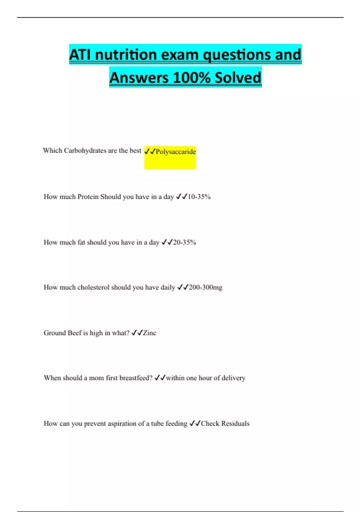 ATI nutrition exam questions and Answers 100% Solved Which Carbohydrates are the best Polysaccaride How much Protein Should you have in a day 10-35% How much fat should you have in a day 20-35% How much cholesterol should you have daily 200-300mg Ground Beef is high in what? Zinc When should a mom first breastfeed? within one hour of delivery How can you prevent aspiration of a tube feeding Check Residuals