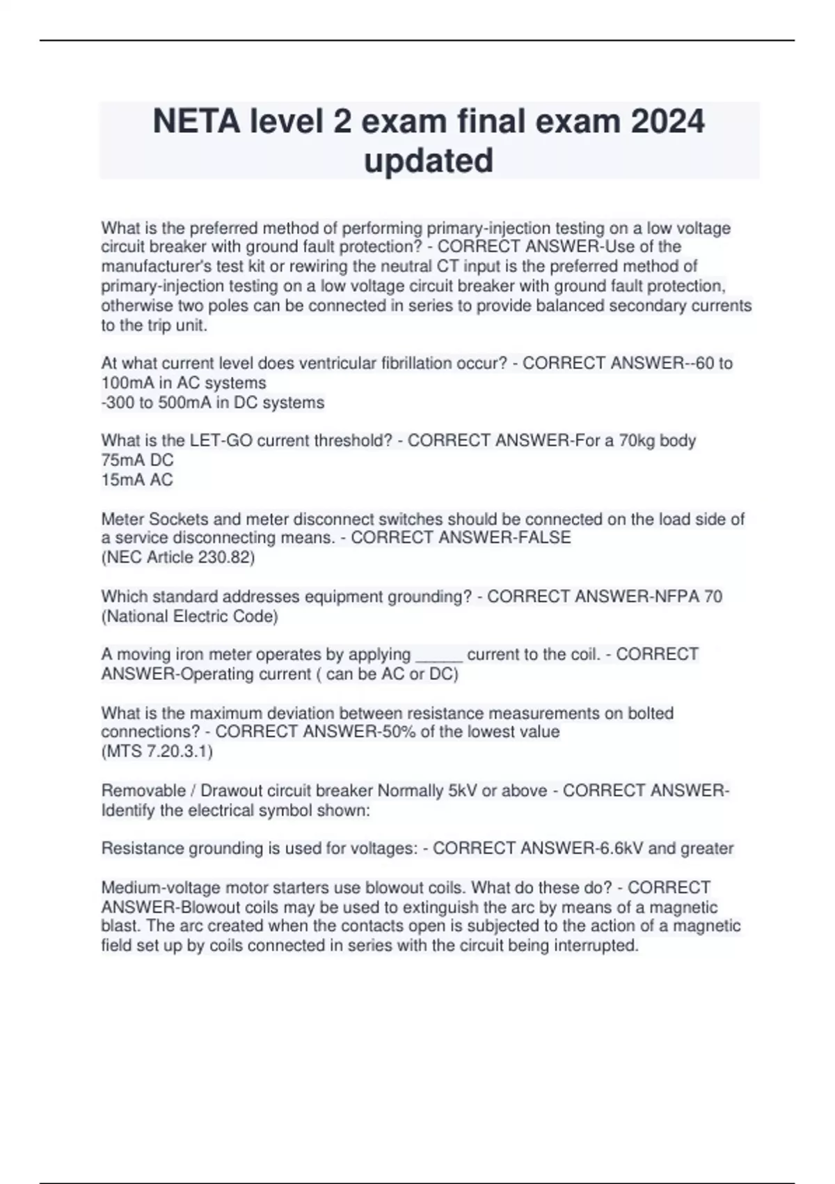 NETA level 2 exam final exam 2024 updated What is the preferred method of performing primary-injection testing on a low voltage circuit breaker with ground fault protection? - CORRECT ANSWER-Use of the manufacturer's test kit or rewiring the neutral CT input is the preferred method of primary-injection testing on a low voltage circuit breaker with ground fault protection, otherwise two poles can be connected in series to provide balanced secondary currents to the trip unit. At what current level does ventricular fibrillation occur? - CORRECT ANSWER--60 to 100mA in AC systems -300 to 500mA in DC systems What is the LET-GO current threshold? - CORRECT ANSWER-For a 70kg body 75mA DC 15mA AC Meter Sockets and meter disconnect switches should be connected on the load side of a service disconnecting means. - CORRECT ANSWER-FALSE (NEC Article 230.82) Which standard addresses equipment grounding? - CORRECT ANSWER-NFPA 70 (National Electric Code) A moving iron meter operates by applying _____ current to the coil. - CORRECT ANSWER-Operating current ( can be AC or DC) What is the maximum deviation between resistance measurements on bolted connections? - CORRECT ANSWER-50% of the lowest value (MTS 7.20.3.1) Removable / Drawout circuit breaker Normally 5kV or above - CORRECT ANSWERIdentify the electrical symbol shown: Resistance grounding is used for voltages: - CORRECT ANSWER-6.6kV and greater Medium-voltage motor starters use blowout coils. What do these do? - CORRECT ANSWER-Blowout coils may be used to extinguish the arc by means of a magnetic blast. The arc created when the contacts open is subjected to the action of a magnetic field set up by coils connected in series with the circuit being interrupted. These coils are called blowout coils because they help blow out the arc magnetically. The arc is magnetically blown into arc chutes where the arc is lengthened, cooled, and extinguished. Medium voltage air circuit breakers use PUFFER TUBES. What do these do? - CORRECT ANSWER-Puffer tubes incorporate the operating mechanism to blow a puff of air through a tube and nozzle to each contact assembly when the breaker is opened. The air helps quench the arc by pushing it up into the arc-chute. Ammeter - CORRECT ANSWER-Identify the electrical symbol shown: SAE grade 1 & 2 Bolt - CORRECT ANSWER-No lines on head Tensile strength 64KSI SAE grade 5 Bolt - CORRECT ANSWER-3 lines on head Tensile strength 105 KSI SAE grade 7 Bolt - CORRECT ANSWER-5 lines on head Tensile strength 133 KSI SAE grade 8 Bolt - CORRECT ANSWER-6 lines on head Tensile strength 150 KSI NFPA 70B 11.27.3 Decal color code RED - CORRECT ANSWER-(Non-serviceable) - Device has a problem detrimental to its proper electrical or mechanical operation such as no trip on one or more phases or high contact resistance readings. This device should not be placed back into service. NFPA 70B 11.27.3 Decal color code yellow - CORRECT ANSWER-(Limited Service) - Device has a minor problem that does not impact equipment serviceability but should be fixed as soon as possible. Some examples of minor problems include slightly lower than acceptable insulation resistance readings or chipped arc chutes. NFPA 70B 11.27.3 Decal color code white - CORRECT ANSWER-(Servicable) - Device is electrically and mechanically sound and suitable for service but may still have minor defects such as slight corrosion or incorrect circuit ID. What instructions govern the performance of a SHORT CIRCUIT STUDY? - CORRECT ANSWER-ANSI/IEEE standard 399 Step by step procedures outlined in the short circuit calculation chapters of IEEE standard 141 and ANSI/IEEE 242. What instructions govern the performance of a Coordination STUDY? - CORRECT ANSWER-ANSI/IEEE STANDARD 399 ANSI/IEEE STANDARD 242 NFPA 70 (NATIONAL ELECTRIC CODE) protective devices Two standards are typically used for the interconnection of smart devices in a substation environment. One is an IEC standard, the other is an IEEE standard. What are the two standards? - CORRECT ANSWER-IEEE C37.1 IEC 61850 Time travel analysis is commonly performed on: - CORRECT ANSWER-is used on medium and high-voltage circuit breakers and provides information as to whether the breaker's operating mechanism is operating properly (NFPA 70B). Which of the following is not a standard dc power source voltage? 1. 24VDC 2. 48VDC 3. 96VDC 4. 125VDC 5. 250VDC - CORRECT ANSWER-3. 96 VDC Medium-voltage is defined by NETA as - CORRECT ANSWER-greater than 1,000 volts and less than 100,000 volts Low-voltage is defined by NETA as - CORRECT ANSWER-less than 1,000 volts High-voltage and Extra-High voltage is defined by NETA as - CORRECT ANSWERgreater than 100kV and less than 1,000kV Class 00 rubber gloves what is the AC / DC max use voltage? - CORRECT ANSWERMax use = 500VAC / 750VDC Class 00 rubber gloves what is the AC retest voltage? - CORRECT ANSWER-2500 VAC Class 00 rubber gloves what is the DC retest voltage? - CORRECT ANSWER-10,000 VD