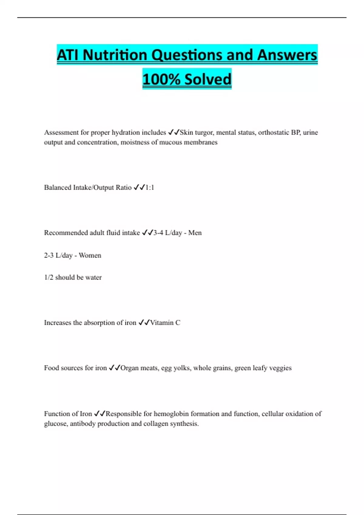 ATI Nutrition Questions and Answers 100% Solved Assessment for proper hydration includes Skin turgor, mental status, orthostatic BP, urine output and concentration, moistness of mucous membranes Balanced Intake/Output Ratio 1:1 Recommended adult fluid intake 3-4 L/day - Men 2-3 L/day - Women 1/2 should be water Increases the absorption of iron Vitamin C Food sources for iron Organ meats, egg yolks, whole grains, green leafy veggies Function of Iron Responsible for hemoglobin formation and function, cellular oxidation of glucose, antibody production and collagen synthesis.