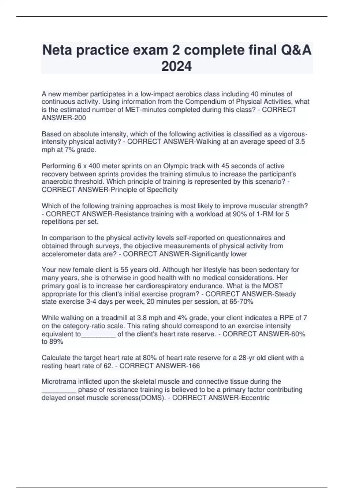 Neta practice exam 2 complete final Q&A 2024 A new member participates in a low-impact aerobics class including 40 minutes of continuous activity. Using information from the Compendium of Physical Activities, what is the estimated number of MET-minutes completed during this class? - CORRECT ANSWER-200 Based on absolute intensity, which of the following activities is classified as a vigorousintensity physical activity? - CORRECT ANSWER-Walking at an average speed of 3.5 mph at 7% grade. Performing 6 x 400 meter sprints on an Olympic track with 45 seconds of active recovery between sprints provides the training stimulus to increase the participant's anaerobic threshold. Which principle of training is represented by this scenario? - CORRECT ANSWER-Principle of Specificity Which of the following training approaches is most likely to improve muscular strength? - CORRECT ANSWER-Resistance training with a workload at 90% of 1-RM for 5 repetitions per set. In comparison to the physical activity levels self-reported on questionnaires and obtained through surveys, the objective measurements of physical activity from accelerometer data are? - CORRECT ANSWER-Significantly lower Your new female client is 55 years old. Although her lifestyle has been sedentary for many years, she is otherwise in good health with no medical considerations. Her primary goal is to increase her cardiorespiratory endurance. What is the MOST appropriate for this client's initial exercise program? - CORRECT ANSWER-Steady state exercise 3-4 days per week, 20 minutes per session, at 65-70% While walking on a treadmill at 3.8 mph and 4% grade, your client indicates a RPE of 7 on the category-ratio scale. This rating should correspond to an exercise intensity equivalent to_________ of the client's heart rate reserve. - CORRECT ANSWER-60% to 89% Calculate the target heart rate at 80% of heart rate reserve for a 28-yr old client with a resting heart rate of 62. - CORRECT ANSWER-166 Microtrama inflicted upon the skeletal muscle and connective tissue during the _________ phase of resistance training is believed to be a primary factor contributing delayed onset muscle soreness(DOMS). - CORRECT ANSWER-Eccentric Which of the following exercises is considered to be isometric? - CORRECT ANSWERProne Plank Which of the following progressions for the squat exercise is most appropriate for a client wishing to increase muscular strength? - CORRECT ANSWER-Increase the workload to a higher percentage of 1-RM Forcibly exhaling against a closed glottis during the concentric phase of a resistance training exercise may cause a dangerously high elevation in blood pressure. This is known as the ____________ - CORRECT ANSWER-Valsalva maneuver Which of the following resistance