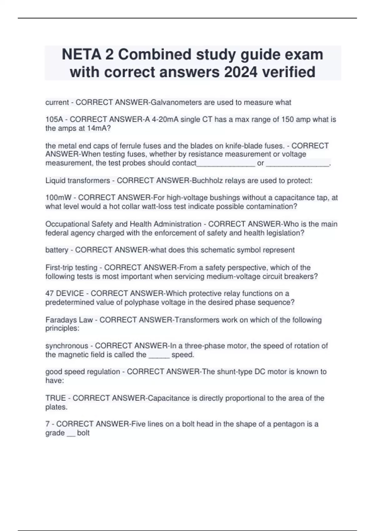 NETA 2 Combined study guide exam with correct answers 2024 verified current - CORRECT ANSWER-Galvanometers are used to measure what 105A - CORRECT ANSWER-A 4-20mA single CT has a max range of 150 amp what is the amps at 14mA? the metal end caps of ferrule fuses and the blades on knife-blade fuses. - CORRECT ANSWER-When testing fuses, whether by resistance measurement or voltage measurement, the test probes should contact______________ or _______________. Liquid transformers - CORRECT ANSWER-Buchholz relays are used to protect: 100mW - CORRECT ANSWER-For high-voltage bushings without a capacitance tap, at what level would a hot collar watt-loss test indicate possible contamination? Occupational Safety and Health Administration - CORRECT ANSWER-Who is the main federal agency charged with the enforcement of safety and health legislation? battery - CORRECT ANSWER-what does this schematic symbol represent First-trip testing - CORRECT ANSWER-From a safety perspective, which of the following tests is most important when servicing medium-voltage circuit breakers? 47 DEVICE - CORRECT ANSWER-Which protective relay functions on a predetermined value of polyphase voltage in the desired phase sequence? Faradays Law - CORRECT ANSWER-Transformers work on which of the following principles: synchronous - CORRECT ANSWER-In a three-phase motor, the speed of rotation of the magnetic field is called the _____ speed. good speed regulation - CORRECT ANSWER-The shunt-type DC motor is known to have: TRUE - CORRECT ANSWER-Capacitance is directly proportional to the area of the plates. 7 - CORRECT ANSWER-Five lines on a bolt head in the shape of a pentagon is