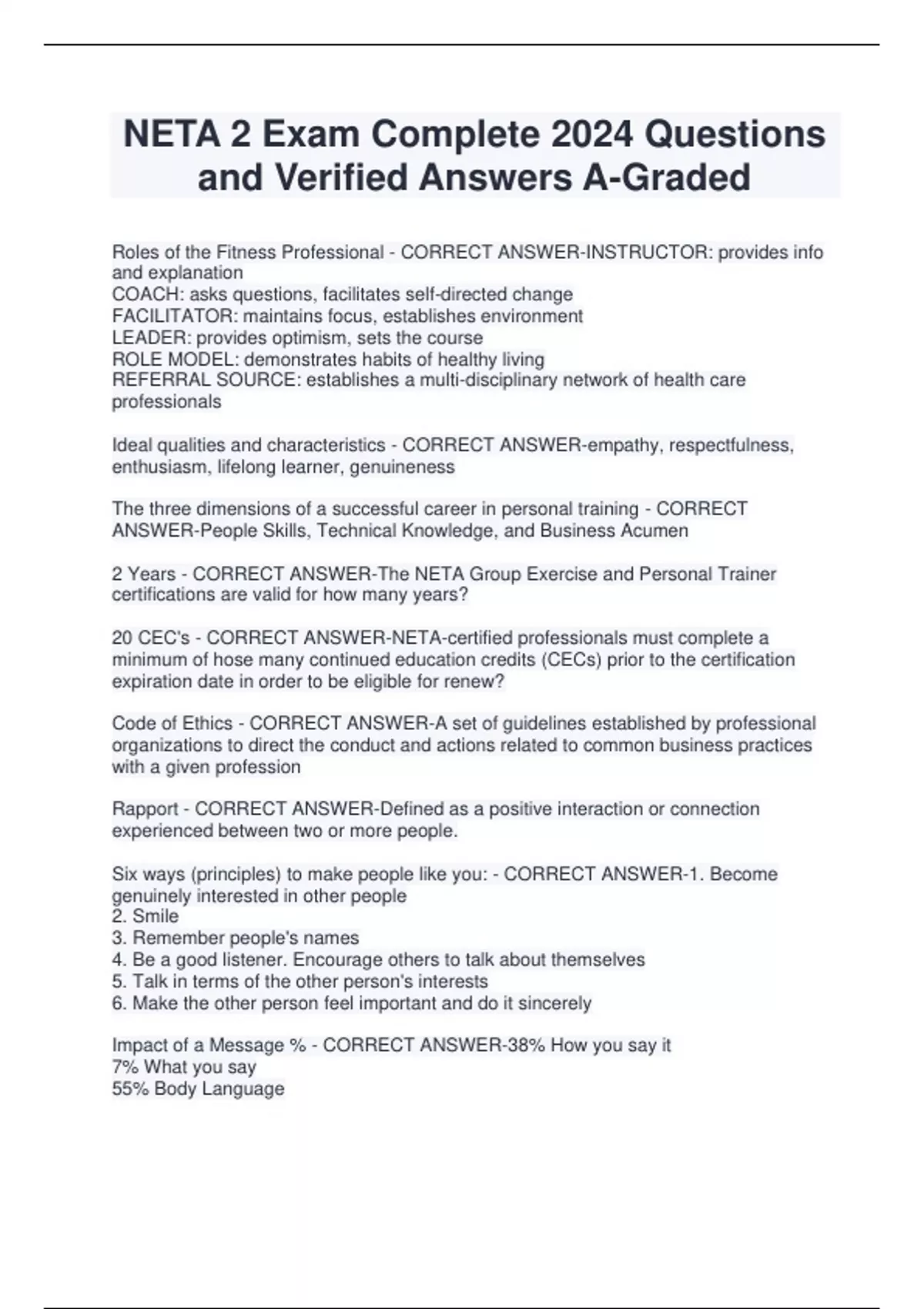 NETA 2 Exam Complete 2024 Questions and Verified Answers A-Graded Roles of the Fitness Professional - CORRECT ANSWER-INSTRUCTOR: provides info and explanation COACH: asks questions, facilitates self-directed change FACILITATOR: maintains focus, establishes environment LEADER: provides optimism, sets the course ROLE MODEL: demonstrates habits of healthy living REFERRAL SOURCE: establishes a multi-disciplinary network of health care professionals Ideal qualities and characteristics - CORRECT ANSWER-empathy, respectfulness, enthusiasm, lifelong learner, genuineness The three dimensions of a successful career in personal training - CORRECT ANSWER-People Skills, Technical Knowledge, and Business Acumen 2 Years - CORRECT ANSWER-The NETA Group Exercise and Personal Trainer certifications are valid for how many years? 20 CEC's - CORRECT ANSWER-NETA-certified professionals must complete a minimum of hose many continued education credits (CECs) prior to the certification expiration date in order to be eligible for renew? Code of Ethics - CORRECT ANSWER-A set of guidelines established by professional organizations to direct the conduct and actions related to common business practices with a given profession Rapport - CORRECT ANSWER-Defined as a positive interaction or connection experienced between two or more people. Six ways (principles) to make people like you: - CORRECT ANSWER-1. Become genuinely interested in other people 2. Smile 3. Remember people's names 4. Be a good listener. Encourage others to talk about themselves 5. Talk in terms of the other person's interests 6. Make the other person feel important and do it sincerely Impact of a Message % - CORRECT ANSWER-38% How you say it 7% What you say 55% Body Language Paraphrasing - CORRECT ANSWER-Re-Stating using SIMILAR words and SIMILAR phrase arrangement to those used by the speaker. Reflecting(Clarifying) - CORRECT ANSWER-Stating what you heard the speaker say using your own words and sentence structure, often making an assumption with regard to the underlying meaning of the statement Repeating (Parroting) - CORRECT ANSWER-Re-stating the message using EXACTLY the same words used by the speaker. Summarizing - CORRECT ANSWER-Stating the key points of a long thought or conversation. Also used to close conversation or transition to a new topic of discussion. Minimal Encouragers - CORRECT ANSWER-Words or short phrases used to encourage the speaker to continue. Also may be nonverbal movements. Questioning - CORRECT ANSWER-Gathering info using both open- and closed- ended questions Is this an OPEN or CLOSED ended question: How do you imagine you will feel when you achieve this goal? - CORRECT ANSWER-Open Is this an OPEN or CLOSED ended question: Waht is your blood pressure? - CORRECT ANSWER-Closed The five stages of the Transtheoretical Model: - CORRECT ANSWER-1. Precontemplation 2. Contemplation 3. Preparation 4. Action 5. Maintenance Precontemplation - CORRECT ANSWER-The individual is not thinking about adopting physical activity or an exercise program and has no intention of beginning in the foreseeable future(6 months) Contemplation - CORRECT ANSWER-The individual has intentions of becoming more physically active and/or beginning an exercise program within the next 6 months Preperation - CORRECT ANSWER-Intentions to become physically active or start exercising with the next month Action - CORRECT ANSWER-Performing regular physical activity and/or exercise up to the minimum level, at least 150 minutes of moderate-intensity leisure-time physical activity per week. Maintenance - CORRECT ANSWER-Individuals move into this phase once they have sustained regular physical activity above the minimum levels for 6 consecutive month