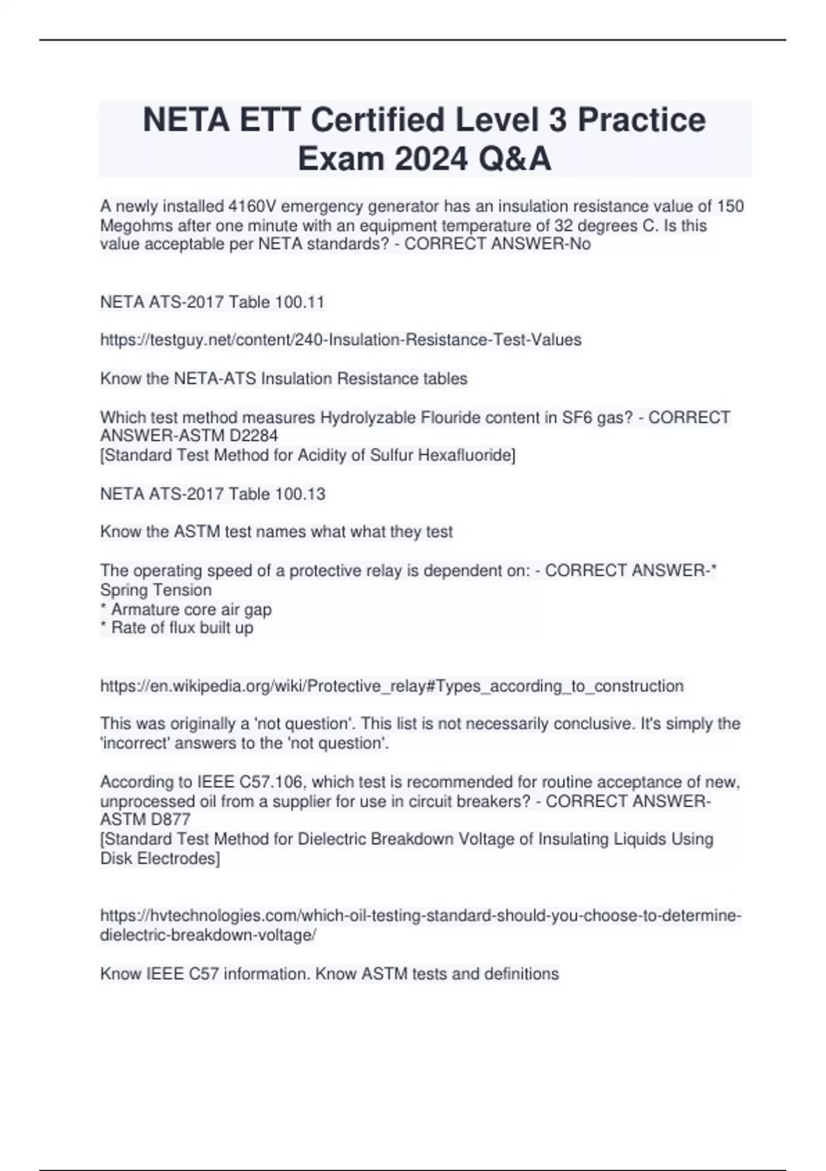 NETA ETT Certified Level 3 Practice Exam 2024 Q&A A newly installed 4160V emergency generator has an insulation resistance value of 150 Megohms after one minute with an equipment temperature of 32 degrees C. Is this value acceptable per NETA standards? - CORRECT ANSWER -No NETA ATS -2017 Table 100.11 https://testguy.net/content/240 -Insulation -Resistance -Test-Values Know the NETA -ATS Insulation Resistance tables Which test method measures Hydrolyzable Flouride content in SF6 gas? - CORRECT ANSWER -ASTM D2284 [Standard Test Method for Acidity of Sulfur Hexafluoride] NETA ATS -2017 Table 100.13 Know the ASTM test names what what they test The operating speed of a protective relay is dependent on: - CORRECT ANSWER -* Spring Tension * Armature core air gap * Rate of flux built up https://en.wikipedia.org/wiki/Protective_relay#Types_according_to_construction This was originally a 'not question'. This list is not necessarily conclusive. It's simply the 'incorrect' answers to the 'not question'. According to IEEE C57.106, which test is recommended for routine acceptance of new, unprocessed oil from a supplier for use in circuit breakers? - CORRECT ANSWER -