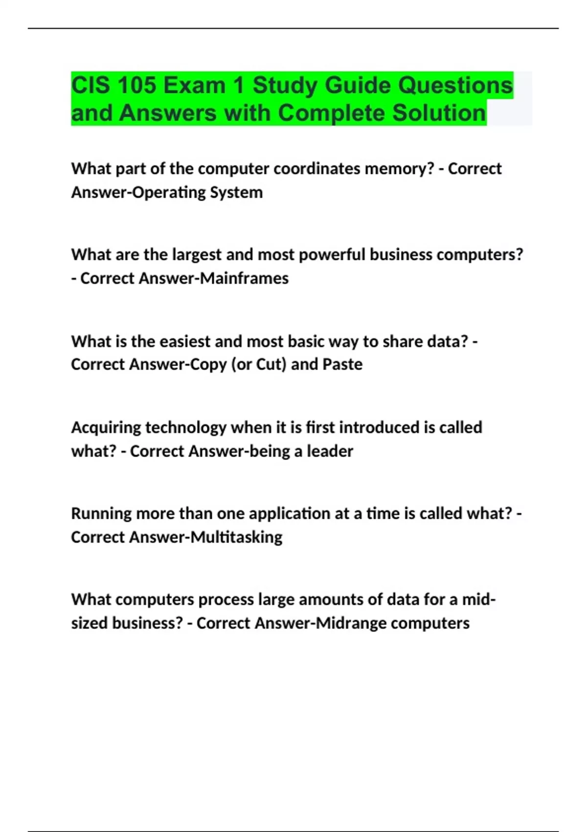 CIS 105 Exam 1 Study Guide Questions and Answers with Complete Solution