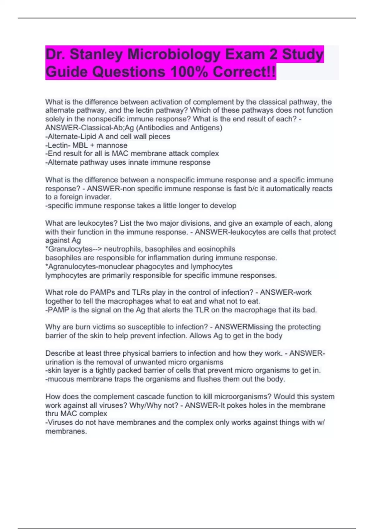 What is the difference between activation of complement by the classical pathway, the alternate pathway, and the lectin pathway? Which of these pathways does not function solely in the nonspecific immune response? What is the end result of each? - ANSWER-Classical-Ab;Ag (Antibodies and Antigens) -Alternate-Lipid A and cell wall pieces -Lectin- MBL + mannose -End result for all is MAC membrane attack complex -Alternate pathway uses innate immune response What is the difference between a nonspecific immune response and a specific immune response? - ANSWER-non specific immune response is fast b/c it automatically reacts to a foreign invader. -specific immune response takes a little longer to develop What are leukocytes? List the two major divisions, and give an example of each, along with their function in the immune response. - ANSWER-leukocytes are cells that protect against Ag *Granulocytes-- neutrophils, basophiles and eosinophils basophiles are responsible for inflammation during immune response. *Agranulocytes-monuclear phagocytes and lymphocytes lymphocytes are primarily responsible for specific immune responses. What role do PAMPs and TLRs play in the control of infection? - ANSWER-work together to tell the macrophages what to eat and what not to eat. -PAMP is the signal on the Ag that alerts the TLR on the macrophage that its bad. Why are burn victims so susceptible to infection? - ANSWERMissing the protecting barrier of the skin to help prevent infection. Allows Ag to get in the body Describe at least three physical barriers to infection and how they work. - ANSWER-urination is the removal of unwanted micro organisms -skin layer is a tightly packed barrier of cells that prevent micro organisms to get in. -mucous membrane traps the organisms and flushes them out the body. How does the complement cascade function to kill microorganisms? Would this system work against all viruses? Why/Why not? - ANSWER-It pokes holes in the membrane thru MAC complex -Viruses do not have membranes and the complex only works against things with w/ membranes.
