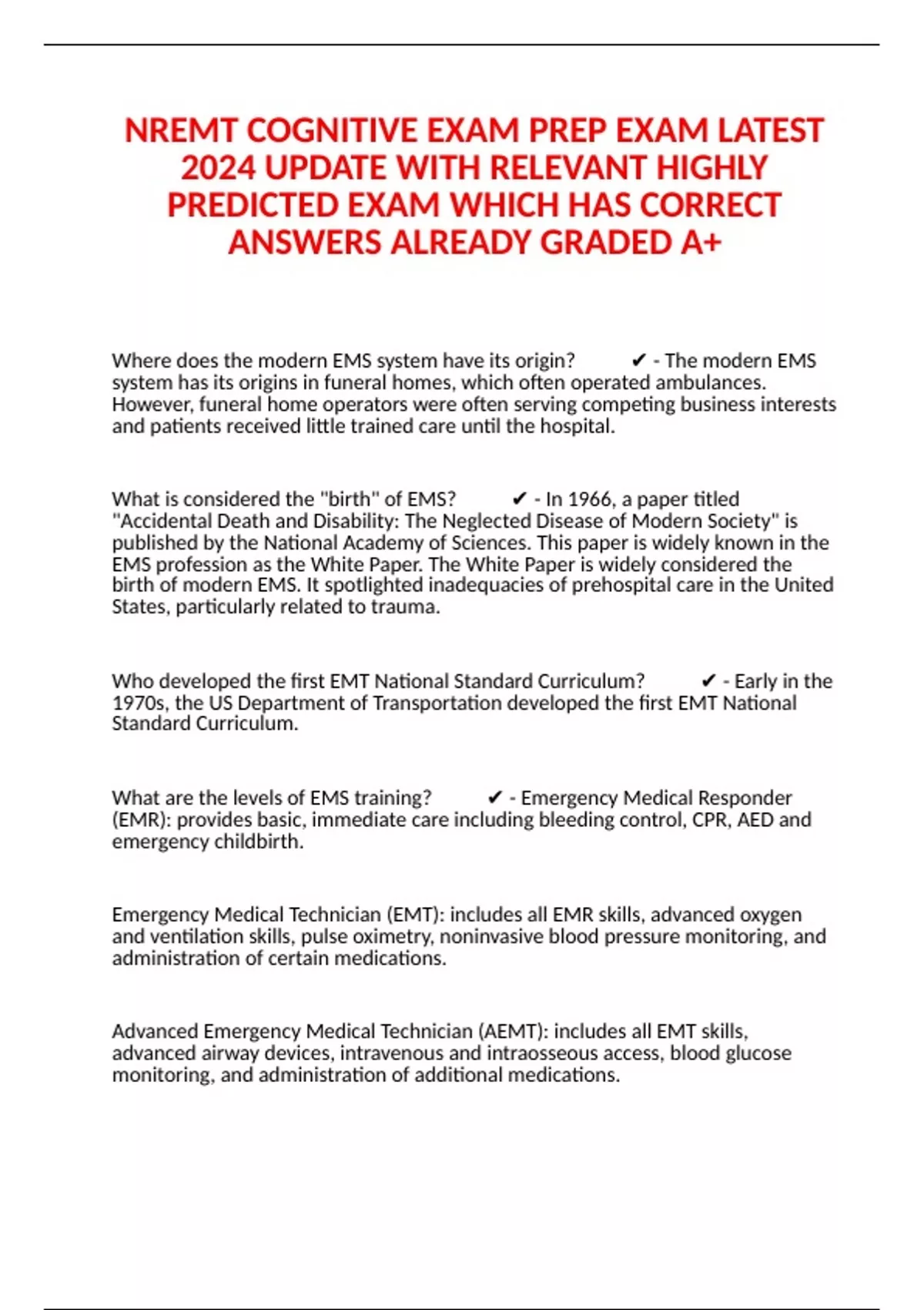 NREMT COGNITIVE EXAM PREP EXAM LATEST 2024 UPDATE WITH RELEVANT HIGHLY PREDICTED EXAM WHICH HAS CORRECT ANSWERS ALREADY GRADED A+
