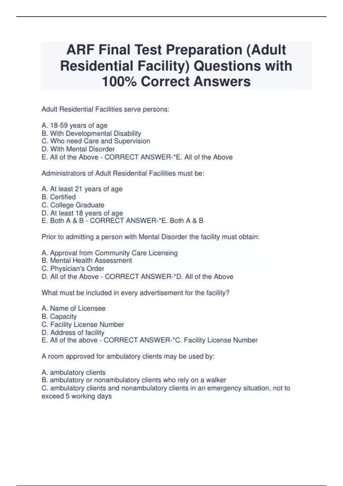 ARF Final Test Preparation (Adult Residential Facility) Questions with 100% Correct Answers Adult Residential Facilities serve persons: A. 18-59 years of age B. With Developmental Disability C. Who need Care and Supervision D. With Mental Disorder E. All of the Above - CORRECT ANSWER-*E. All of the Above Administrators of Adult Residential Facilities must be: A. At least 21 years of age B. Certified C. College Graduate D. At least 18 years of age E. Both A & B - CORRECT ANSWER-*E. Both A & B Prior to admitting a person with Mental Disorder the facility must obtain: A. Approval from Community Care Licensing B. Mental Health Assessment C. Physician's Order D. All of the Above - CORRECT ANSWER-*D. All of the Above What must be included in every advertisement for the facility? A. Name of Licensee B. Capacity C. Facility License Number D. Address of facility E. All of the above - CORRECT ANSWER-*C. Facility License Number A room approved for ambulatory clients may be used by: A. ambulatory clients B. ambulatory or nonambulatory clients who rely on a walker C. ambulatory clients and nonambulatory clients in an emergency situation, not to exceed 5 working days D. ambulatory clients and clients who are transfer dependent - CORRECT ANSWER- *A. ambulatory clients What is included in the facility license application? A. name or proposed name of the facility B. name and address of owner of facility premises of applicant is renting or leasing C. information concerning the city or county fire department having jurisdiction in the area where the facility is located D. all of the above E. a and b F. none of the above - CORRECT ANSWER-*D. all of the above All community care facilities where water for human consumption is from a private source shall: A. hook up to a city water supply B. install a chlorinating system C. test the water on a weekly basis D. none of the above - CORRECT ANSWER-*D. none of the above Evidence of an onsite bacteriological analysis of the water (when from a private source) shall be conducted in a six bed facility: A. upon initial license and every 60 days B. upon initial license and when evidence supports the need C. only upon initial license - CORRECT ANSWER-*B. upon initial license and when evidence supports the need What is required when a facility changes location, or transfers the majority of the stock or possibly when increasing capacity? A. a new license application B. list of all employed staff C. addition of another assistant administrator - CORRECT ANSWER-*A. a new license application The department requires start up funds equal to ____ months operating expenses. A. three months B. six months C. twelve months D. twenty four months - CORRECT ANSWER-*A. three months No person other than the _____________ shall alter the prescription label. A. resident B. licensee C. nurse D. dispensing pharmacist E. c and d - CORRECT ANSWER-*D. dispensing pharmacist Medications shall be centrally stored when A. the preservation of medication requires refrigeration B. the medication is determined by physician to be hazardous if kept by the resident C. resident is an ISS recipient D. The administrator determines the medication to be a safety hazard E. All of the above F. All except c and d G. All except c - CORRECT ANSWER-*G. All except c Prescription medications which are not taken with the resident upon termination of services shall A. be given to a family member B. be available to other residents who ta