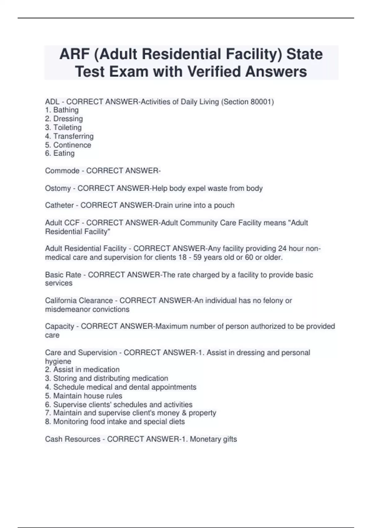 ARF (Adult Residential Facility) State Test Exam with Verified Answers ADL - CORRECT ANSWER-Activities of Daily Living (Section 80001) 1. Bathing 2. Dressing 3. Toileting 4. Transferring 5. Continence 6. Eating Commode - CORRECT ANSWEROstomy - CORRECT ANSWER-Help body expel waste from body Catheter - CORRECT ANSWER-Drain urine into a pouch Adult CCF - CORRECT ANSWER-Adult Community Care Facility means "Adult Residential Facility" Adult Residential Facility - CORRECT ANSWER-Any facility providing 24 hour nonmedical care and supervision for clients 18 - 59 years old or 60 or older. Basic Rate - CORRECT ANSWER-The rate charged by a facility to provide basic services California Clearance - CORRECT ANSWER-An individual has no felony or misdemeanor convictions Capacity - CORRECT ANSWER-Maximum number of person authorized to be provided care Care and Supervision - CORRECT ANSWER-1. Assist in dressing and personal hygiene 2. Assist in medication 3. Storing and distributing medication 4. Schedule medical and dental appointments 5. Maintain house rules 6. Supervise clients' schedules and activities 7. Maintain and supervise client's money & property 8. Monitoring food intake and special diets Cash Resources - CORRECT ANSWER-1. Monetary gifts 2. Tax credits or refunds 3. Earnings from employment or workshops 4. Personal or incidental funding, such as SSI/SSP 5. Allowances paid to children Certified Administrator - CORRECT ANSWER-An administrator who has been issued a group home or adult residential facility certificate by the Department and whose certificate is current. Community Care Facility (CCF) - CORRECT ANSWER-Any facility providing nonmedical care and supervision Community Treat Facility (CTF) - CORRECT ANSWER-Any residential facility providing mental health treatment services to children in a group setting Conservator - CORRECT ANSWER-A person appointed by the Superior Court to care for the person and/or estate Consultant - CORRECT ANSWER-A person professionally qualified by training or experience to provide expert information on a particular subject Control of Property - CORRECT ANSWER-The right to enter, occupy, and maintain the operation of the facility 1. Grant deed showing ownership 2. Lease/Rental Agreement 3. Court order or similar document Criminal Record Clearance - CORRECT ANSWER-An individual has a California clearance and an FBI clearance Deficiency - CORRECT ANSWER-any failure to comply with any provision of the Community Care Facilities Act and/or regulations by the Licensing Department (a.k.a. breaking the rules) Delayed-Egress Device - CORRECT ANSWERTrue or False: These devices shall not delay any resident's departure from the facility for longer than 60 seconds. - CORRECT ANSWER-False: These devices shall not delay any resident's departure from the facility for longer than 30 seconds. True or False: Manual deactivation of egress-control device upon activation of a sprinkler system or detection system - CORRECT ANSWER-False: Automatic deactivation of egress-control device upon activation of a sprinkler system or detection syste