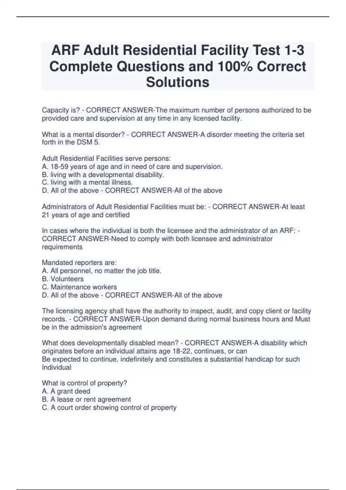 ARF Adult Residential Facility Test 1-3 Complete Questions and 100% Correct Solutions Capacity is? - CORRECT ANSWER-The maximum number of persons authorized to be provided care and supervision at any time in any licensed facility. What is a mental disorder? - CORRECT ANSWER-A disorder meeting the criteria set forth in the DSM 5. Adult Residential Facilities serve persons: A. 18-59 years of age and in need of care and supervision. B. living with a developmental disability. C. living with a mental illness. D. All of the above - CORRECT ANSWER-All of the above Administrators of Adult Residential Facilities must be: - CORRECT ANSWER-At least 21 years of age and certified In cases where the individual is both the licensee and the administrator of an ARF: - CORRECT ANSWER-Need to comply with both licensee and administrator requirements Mandated reporters are: A. All personnel, no matter the job title. B. Volunteers C. Maintenance workers D. All of the above - CORRECT ANSWER-All of the above The licensing agency shall have the authority to inspect, audit, and copy client or facility records. - CORRECT ANSWER-Upon demand during normal business hours and Must be in the admission's agreement What does developmentally disabled mean? - CORRECT ANSWER-A disability which originates before an individual attains age 18-22, continues, or can Be expected to continue, indefinitely and constitutes a substantial handicap for such Individual What is control of property? A. A grant deed B. A lease or rent agreement C. A court order showing control of propert