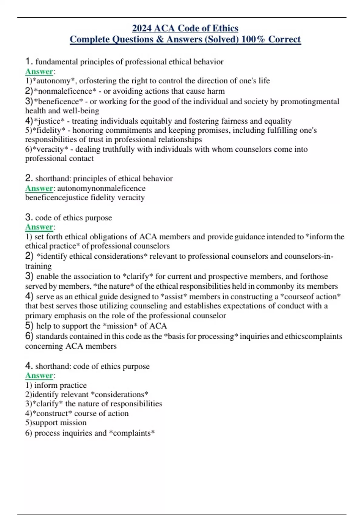 2024 ACA Code of Ethics Complete Questions & Answers (Solved) 100% Correct 1. fundamental principles of professional ethical behavior Answer: 1)*autonomy*, orfostering the right to control the direction of one's life 2)*nonmaleficence* - or avoiding actions that cause harm 3)*beneficence* - or working for the good of the individual and society by promotingmental health and well-being 4)*justice* - treating individuals equitably and fostering fairness and equality 5)*fidelity* - honoring commitments and keeping promises, including fulfilling one's responsibilities of trust in professional relationships 6)*veracity* - dealing truthfully with individuals with whom counselors come into professional contact 2. shorthand: principles of ethical behavior Answer: autonomynonmaleficence beneficencejustice fidelity veracity 3. code of ethics purpose Answer: 1) set forth ethical obligations of ACA members and provide guidance intended to *inform the ethical practice* of professional counselors 2) *identify ethical considerations* relevant to professional counselors and counselors-intraining 3) enable the association to *clarify* for current and prospective members, and forthose served by members, *the nature* ofthe ethicalresponsibilities held in commonby its members 4) serve as an ethical guide designed to *assist* members in constructing a *courseof action* that best serves those utilizing counseling and establishes expectations of conduct with a primary emphasis on the role of the professional counselor 5) help to support the *mission* of ACA 6) standards contained in this code asthe *basisfor processing* inquiries and ethicscomplaints concerning ACA members 4. shorthand: code of ethics purpose Answer: 1) inform practice 2)identify relevant *considerations* 3)*clarify* the nature of responsibilities 4)*construct* course of action 5)support mission 6) process inquiries and *complaints*