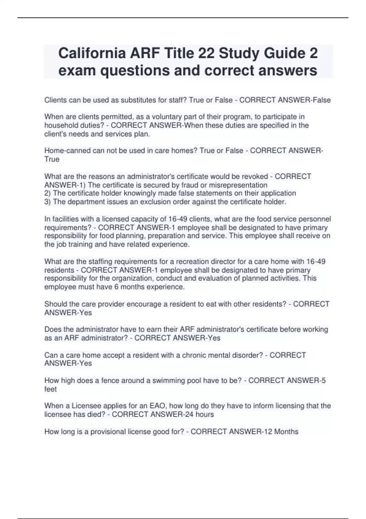California ARF Title 22 Study Guide 2 exam questions and correct answers Clients can be used as substitutes for staff? True or False - CORRECT ANSWER-False When are clients permitted, as a voluntary part of their program, to participate in household duties? - CORRECT ANSWER-When these duties are specified in the client's needs and services plan. Home-canned can not be used in care homes? True or False - CORRECT ANSWERTrue What are the reasons an administrator's certificate would be revoked - CORRECT ANSWER-1) The certificate is secured by fraud or misrepresentation 2) The certificate holder knowingly made false statements on their application 3) The department issues an exclusion order against the certificate holder. In facilities with a licensed capacity of 16-49 clients, what are the food service personnel requirements? - CORRECT ANSWER-1 employee shall be designated to have primary responsibility for food planning, preparation and service. This employee shall receive on the job training and have related experience. What are the staffing requirements for a recreation director for a care home with 16-49 residents - CORRECT ANSWER-1 employee shall be designated to have primary responsibility for the organization, conduct and evaluation of planned activities. This employee must have 6 months experience. Should the care provider encourage a resident to eat with other residents? - CORRECT ANSWER-Yes Does the administrator have to earn their ARF administrator's certificate before working as an ARF administrator? - CORRECT ANSWER-Yes Can a care home accept a resident with a chronic mental disorder? - CORRECT ANSWER-Yes How high does a fence around a swimming pool have to be? - CORRECT ANSWER-5 feet When a Licensee applies for an EAO, how long do they have to inform licensing that the licensee has died? - CORRECT ANSWER-24 hour