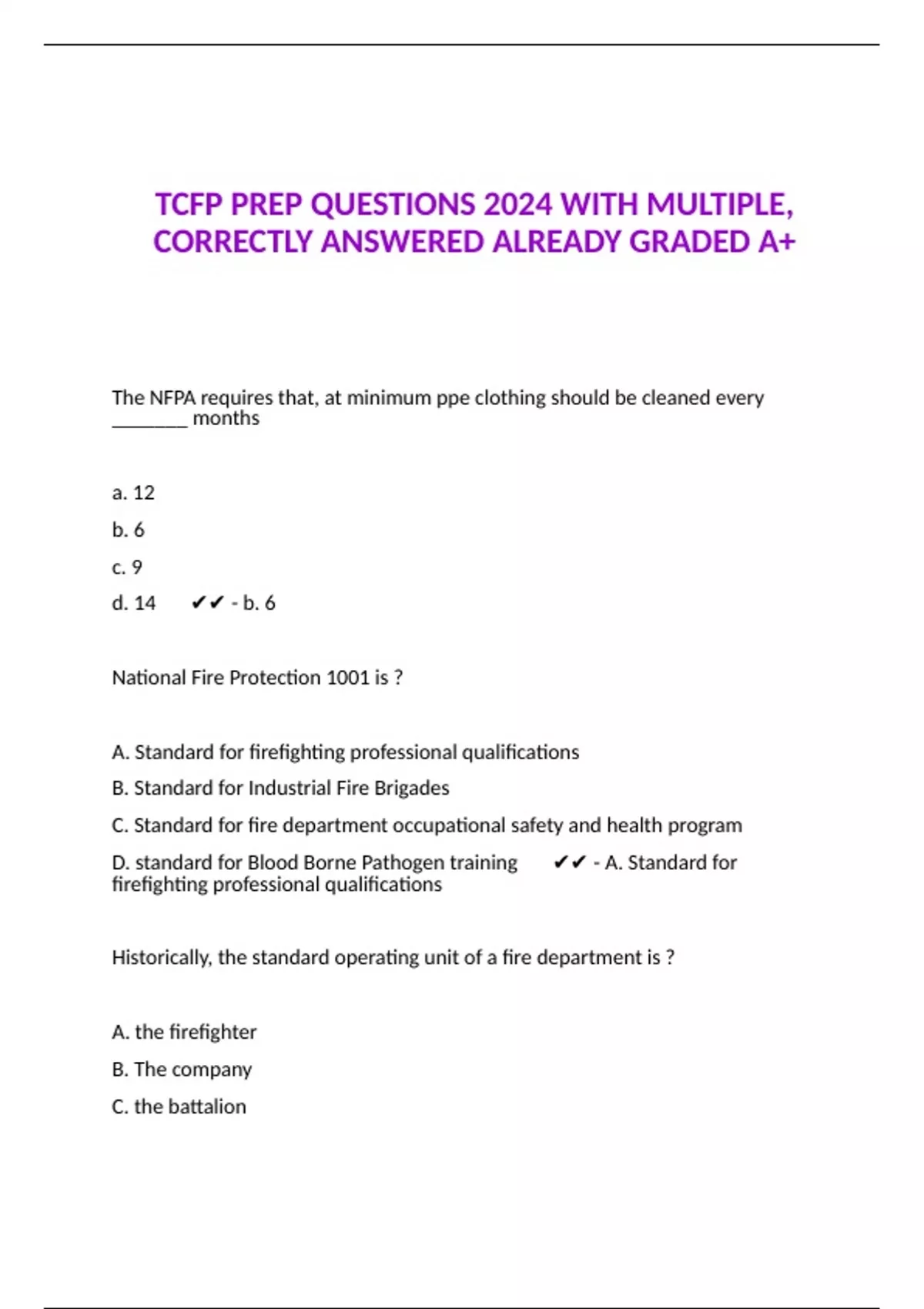 TCFP PREP QUESTIONS 2024 WITH MULTIPLE, CORRECTLY ANSWERED ALREADY GRADED A+ TCFP PREP QUESTIONS 2024 WITH MULTIPLE, CORRECTLY ANSWERED ALREADY GRADED A+
