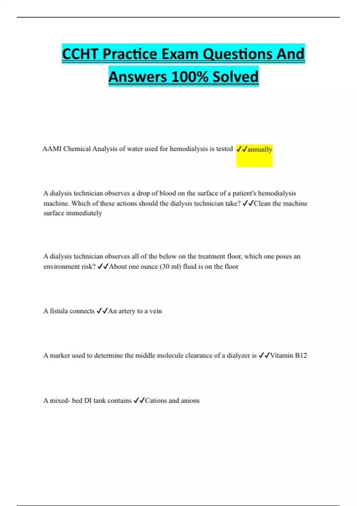 CCHT Practice Exam Questions And Answers 100% Solved AAMI Chemical Analysis of water used for hemodialysis is tested annually A dialysis technician observes a drop of blood on the surface of a patient's hemodialysis machine. Which of these actions should the dialysis technician take? Clean the machine surface immediately A dialysis technician observes all of the below on the treatment floor, which one poses an environment risk? About one ounce (30 ml) fluid is on the floor A fistula connects An artery to a vein