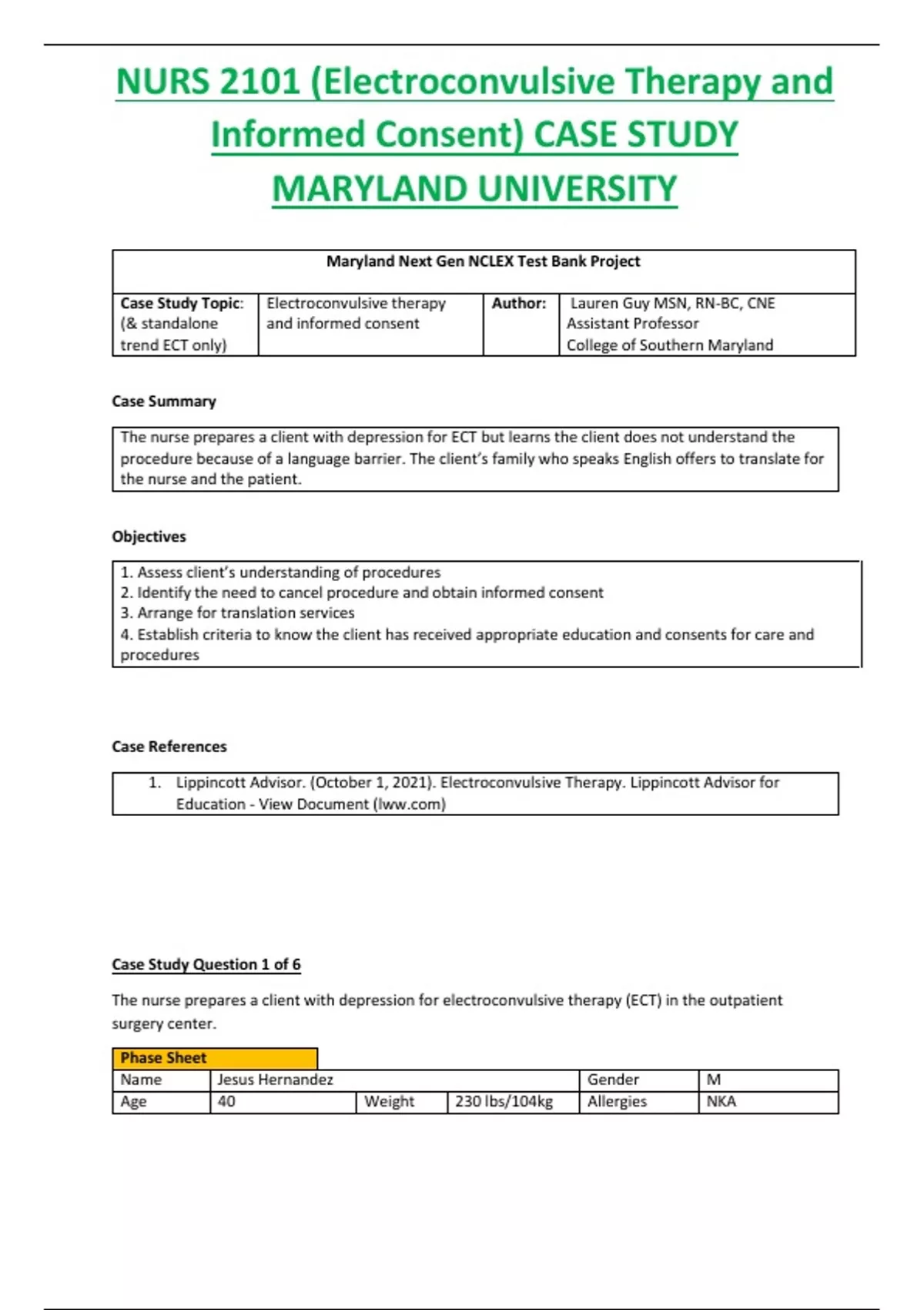 NURS 2101 (Electroconvulsive Therapy and Informed Consent) CASE STUDY MARYLAND UNIVERSITY