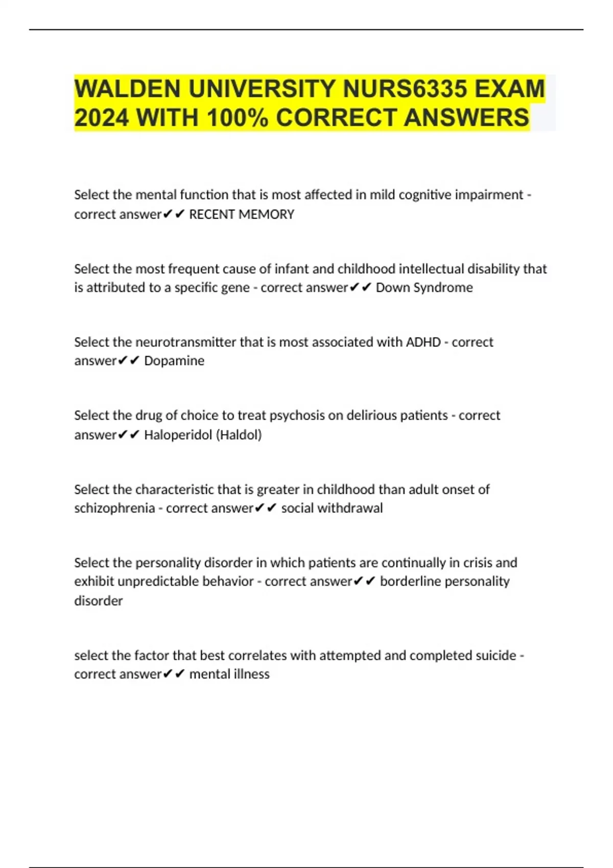 WALDEN UNIVERSITY NURS6335 EXAM 2024 WITH 100% CORRECT ANSWERS Select the mental function that is most affected in mild cognitive impairment - correct answer RECENT MEMORY Select the most frequent cause of infant and childhood intellectual disability that is attributed to a specific gene - correct answer Down Syndrome Select the neurotransmitter that is most associated with ADHD - correct answer Dopamine Select the drug of choice to treat psychosis on delirious patients - correct answer Haloperidol (Haldol) Select the characteristic that is greater in childhood than adult onset of schizophrenia - correct answer social withdrawal