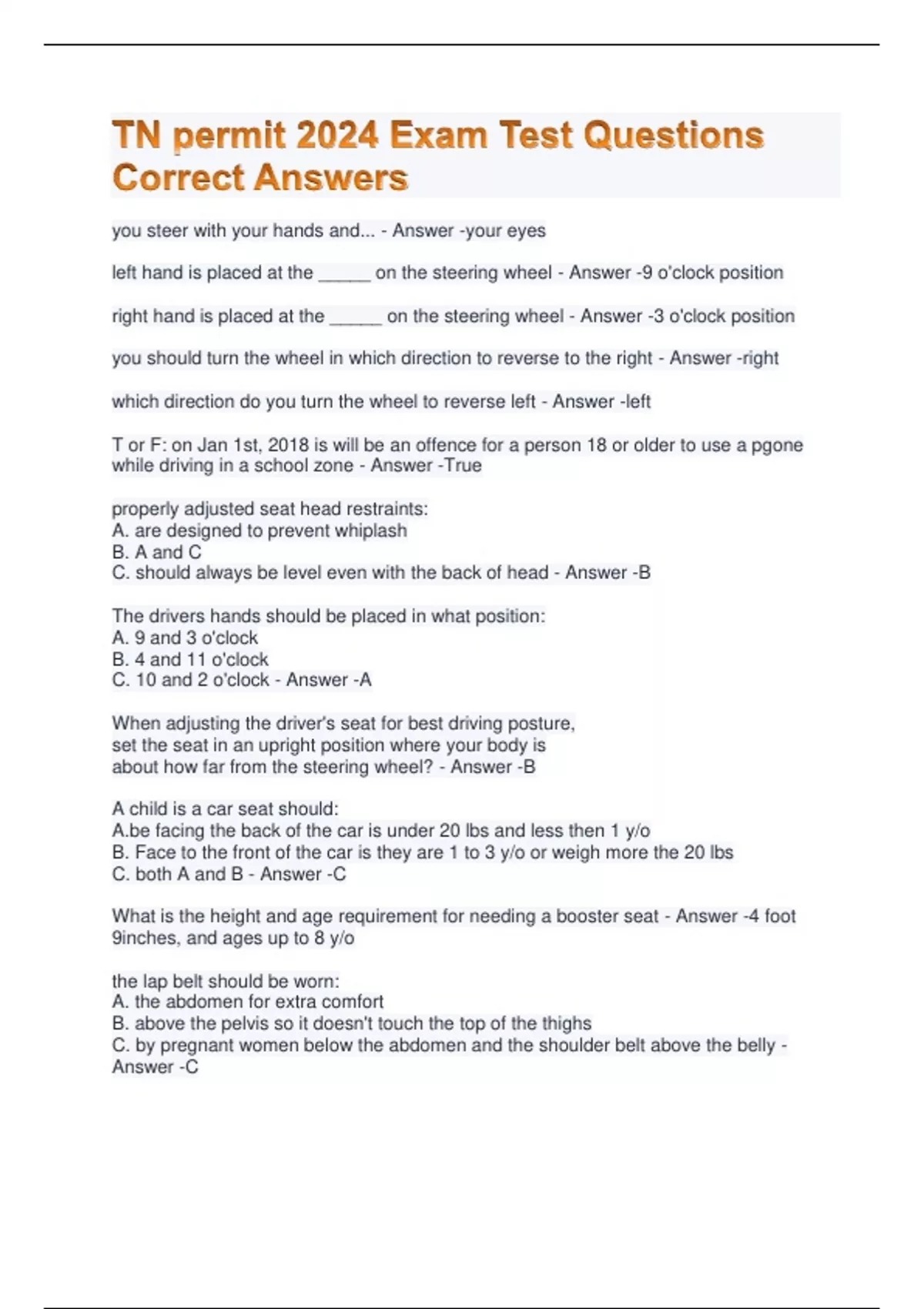 TN permit 2024 Exam Test Questions Correct Answers you steer with your hands and... - Answer -your eyes left hand is placed at the _____ on the steering wheel - Answer -9 o'clock position right hand is placed at the _____ on the steering wheel - Answer -3 o'clock position you should turn the wheel in which direction to reverse to the right - Answer -right which direction do you turn the wheel to reverse left - Answer -left T or F: on Jan 1st, 2018 is will be an offence for a person 18 or older to use a pgone while driving in a school zone - Answer -True